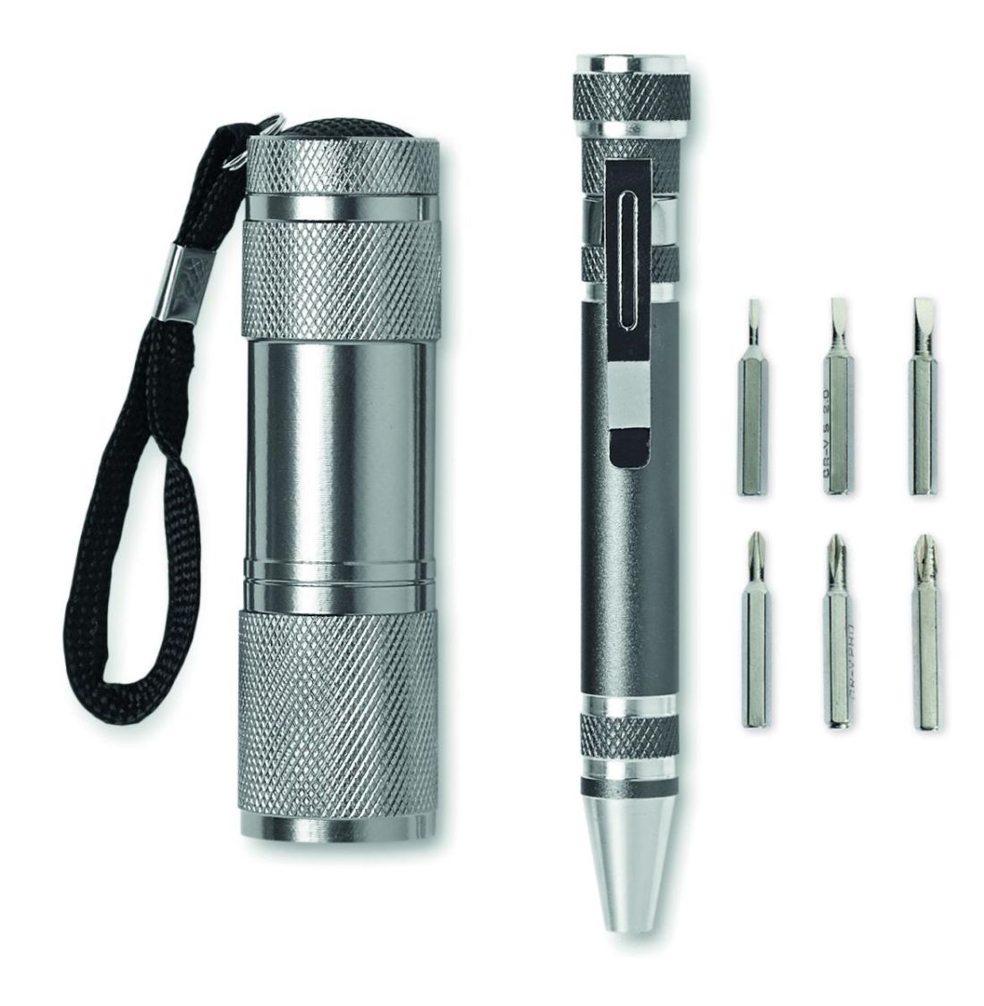 Set de linterna de 9 LED de aluminio con set de herramientas en forma de bolígrafo con 6 cabezales diferentes. 3 pilas AAA no incluidas. Presentado en caja.