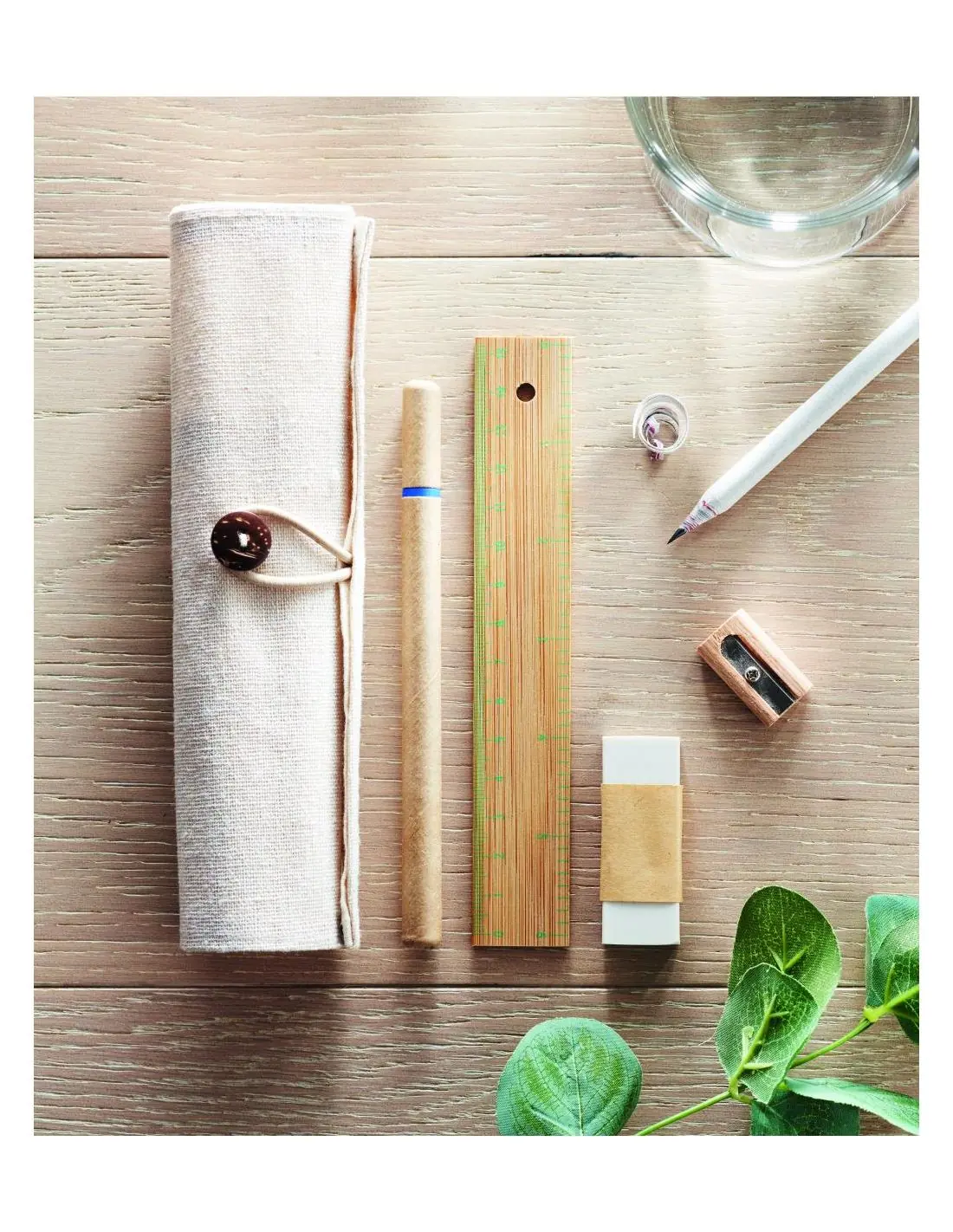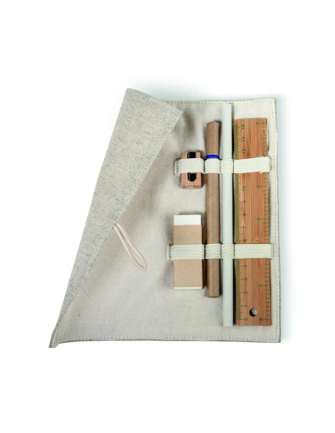 Estuche realizado en yute y algodón que incluye una regla realizada en bambú, un lápiz de papel, un bolígrafo de tinta azul con el cuerpo de cartón, un sacapuntas de madera y una goma de borrar. El bambú es material natural, el color del articulo puede variar.