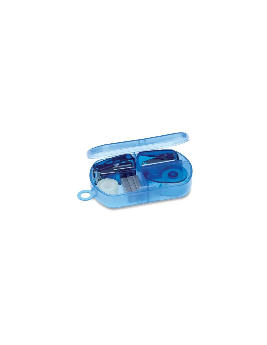 Set de escritorio indispensable. Incluye dispensador de cinta adhesiva, mini grapadora, 300 grapas, perforador de 1 agujero y cinta adhesiva de recambio. Presentado en estuche de plástico translúcido.