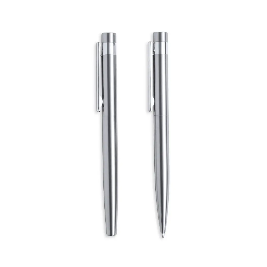 Set eco-friendly de bolígrafo y roller, fabricados en acero inox reciclado. Incluye: Bolígrafo de mecanismo giratorio, con cuerpo en acabado plateado...