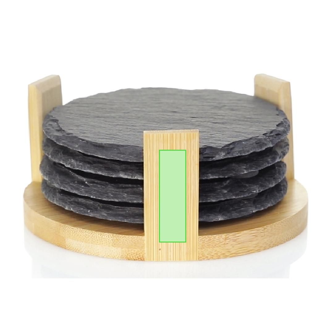 Set de 4posavasos fabricados en pizarra natural, con soporte de bambú. Presentada en atractiva caja individual de diseño acabado kraft.