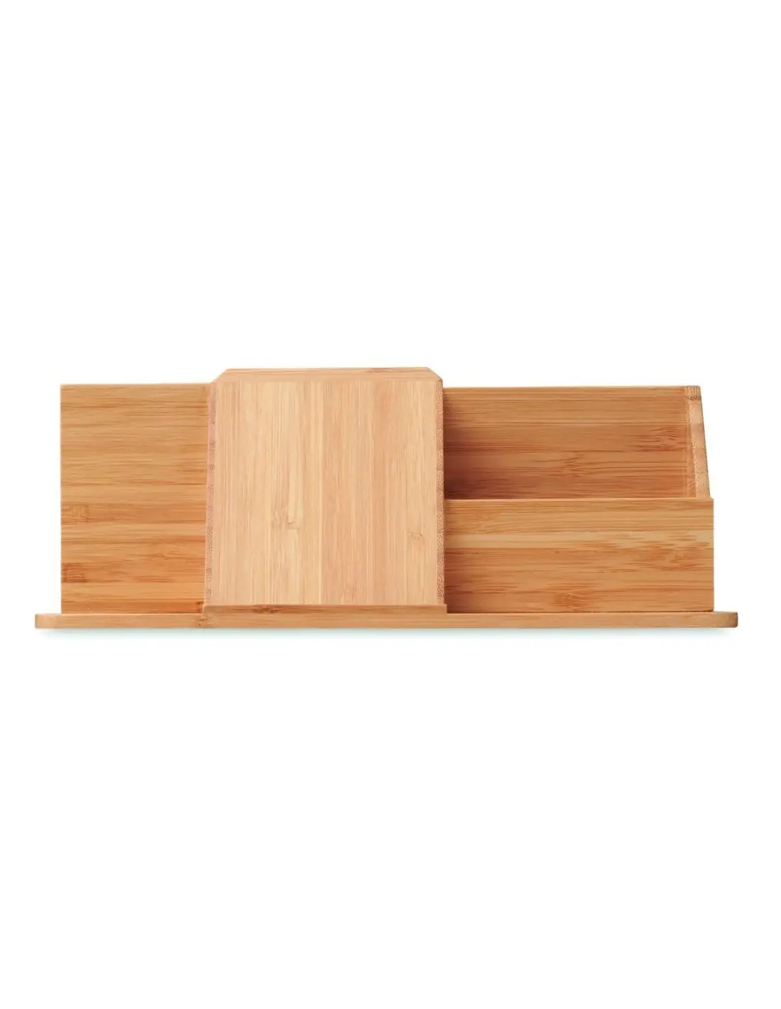 Organizador de sobremesa de bambú con soporte para bolígrafos y con soporte para teléfono de carga inalámbrica de 15W. Salida: DC 9V/1.1A (15W) para una carga rápida. El bambú es material natural, el color del articulo puede variar. FSC®-certified | FSC 100 %, P5.7, FSC-C213206 FSC 100% | N5.7 | FSC-C213206