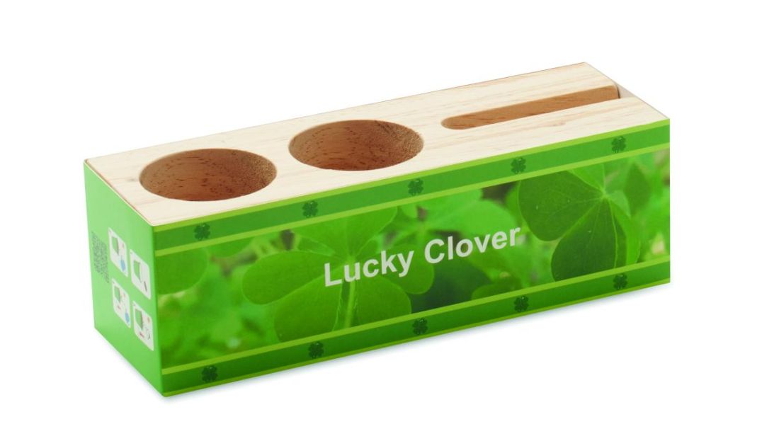 Soporte de madera de sobremesa con soporte para bolígrafo y teléfono. Incluye semillas de trébol. Tableta de tierra incluida. FSC®-certified | FSC 100%, W13.2, FSC-C213206