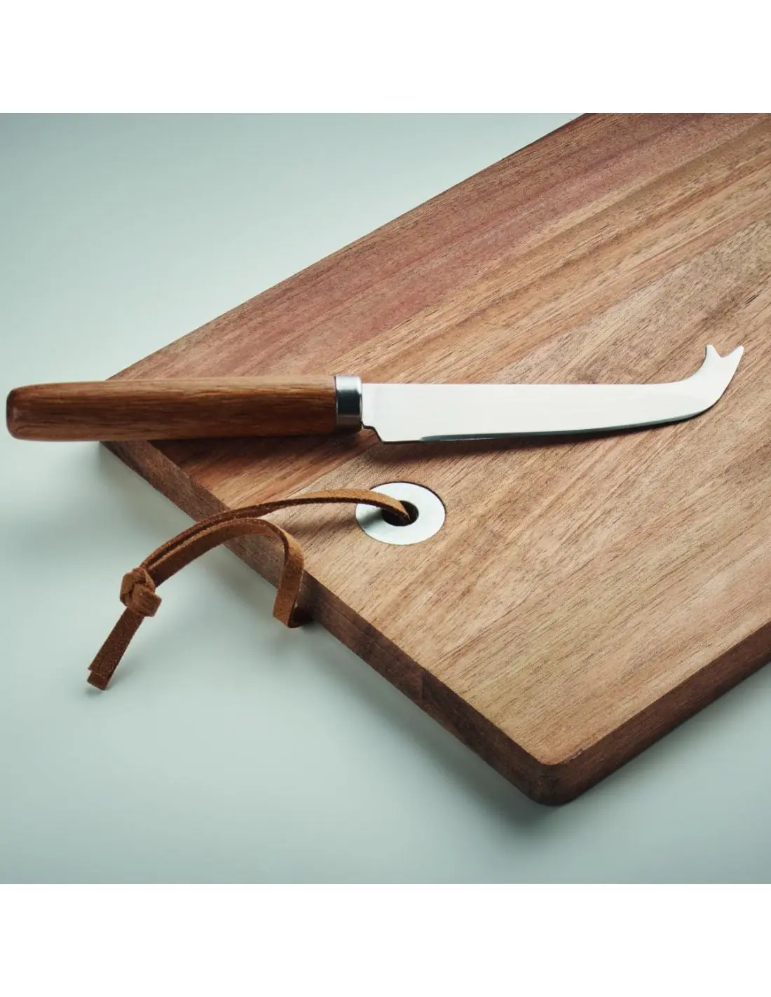 Set tabla para quesos de madera de acacia con cuchillo. Presentado en caja de regalo de cartón ondulado. La madera es un material natural, el color del articulo puede variar de unas piezas a otras.