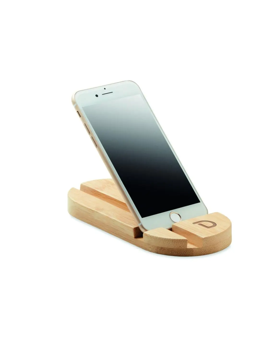 Soporte de bambú para tablet o smartphone. Este soporte de madera natural para teléfonos puede sostener smartphones o tabletas ahí donde estes. Ideal si quiere ver una película o leer algo sin tener que sujetar el dispositivo. El bambú es un material natural, el color del articulo, la medida y la impresión sobre el puede variar. FSC®-certified | FSC 100%, N5.7, FSC-C213206