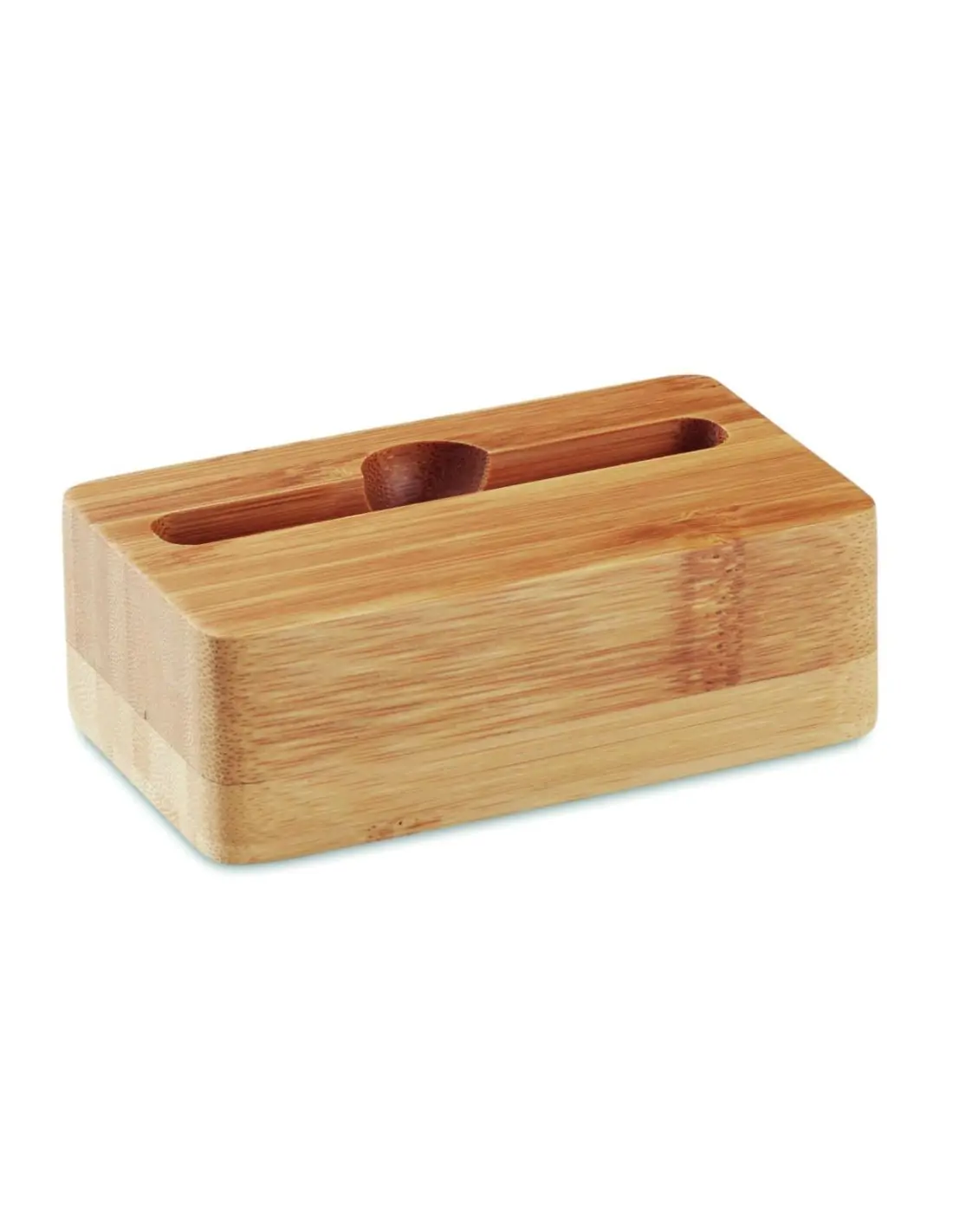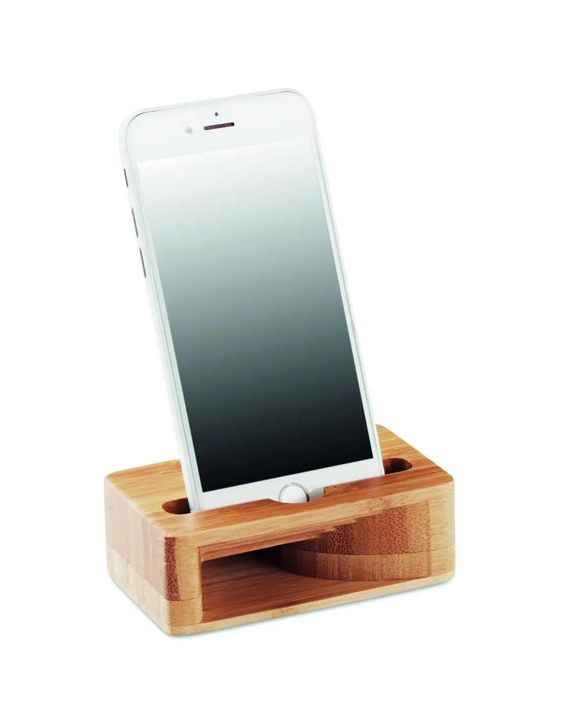 Soporte para smartphone y amplificador en bambú. El bambú es un material natural, el color del articulo, la medida y la impresión sobre el puede va…