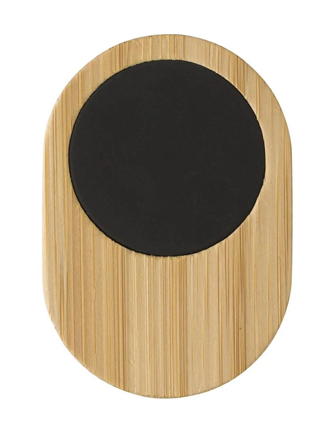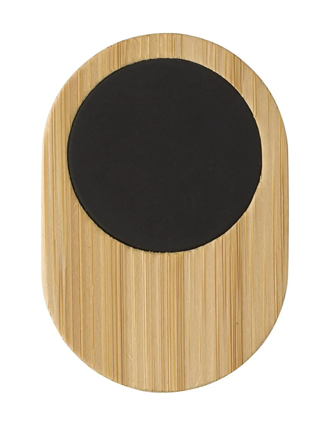 Soporte para teléfono de bambú para uso en el automóvil, colocándolo en la rejilla de ventilación. Con un adhesivo magnético para fijar al teléfono. Presentado en una caja de cartón marrón.