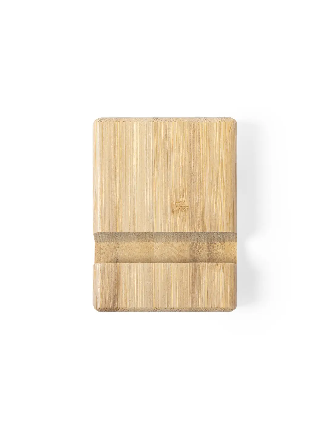 Soporte de línea nature para dispositivos móviles (smartphones y tablets). Fabricado en resistente bambú de acabado lacado, con ranura/soporte en ambas caras.