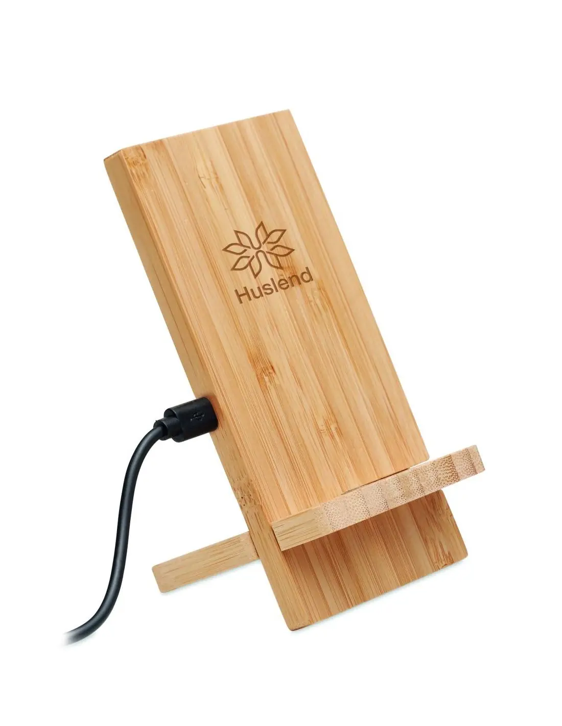Soporte de carga inalámbrica de doble bobina en bambú. Coloca el teléfono sobre él para comenzar la carga. Incluye 2 piezas, requiere montaje. Salida: DC 9V/1.1A (10W) para una carga rápida. El bambú es material natural, el color del articulo puede v FSC 100% | N5.7 | FSC-C213206