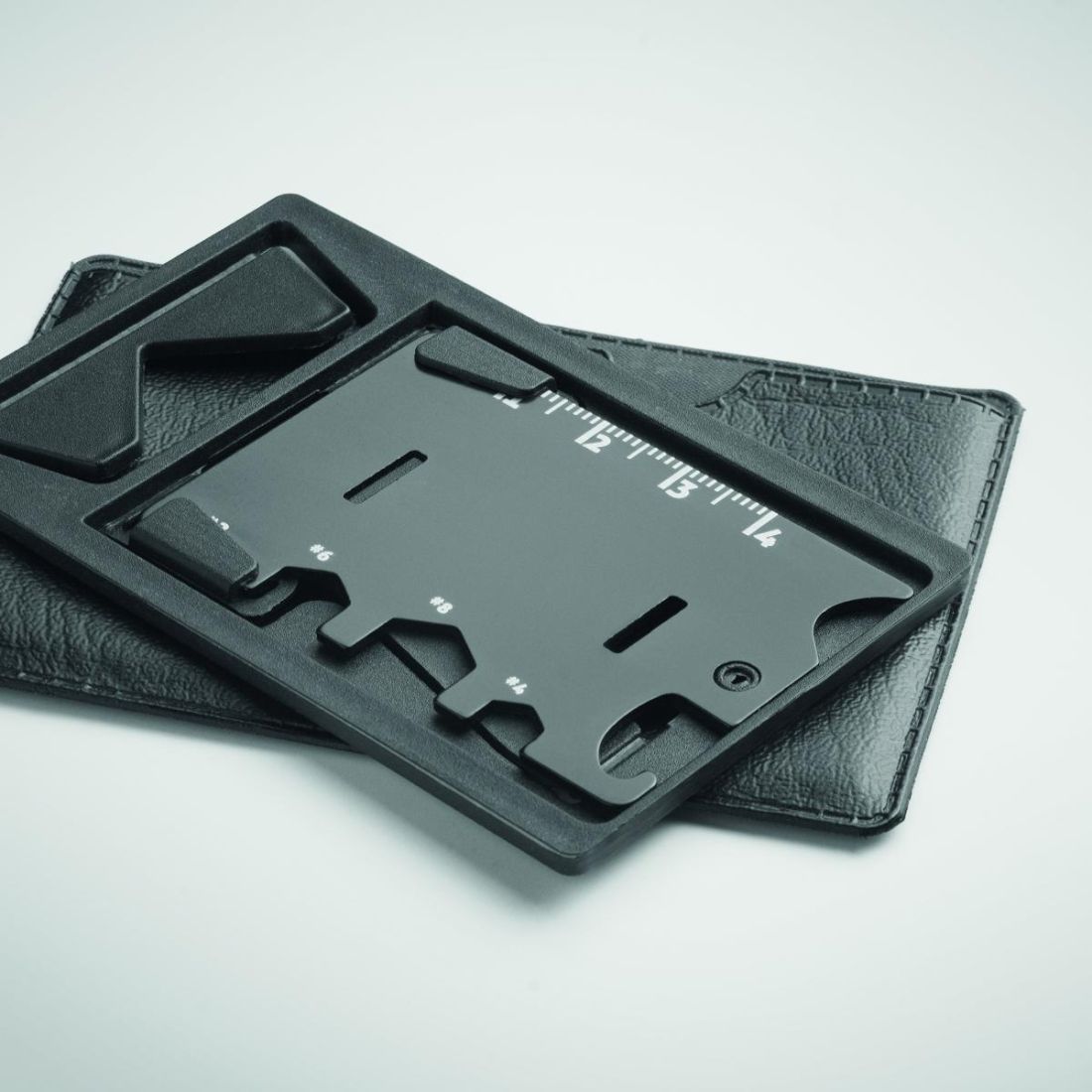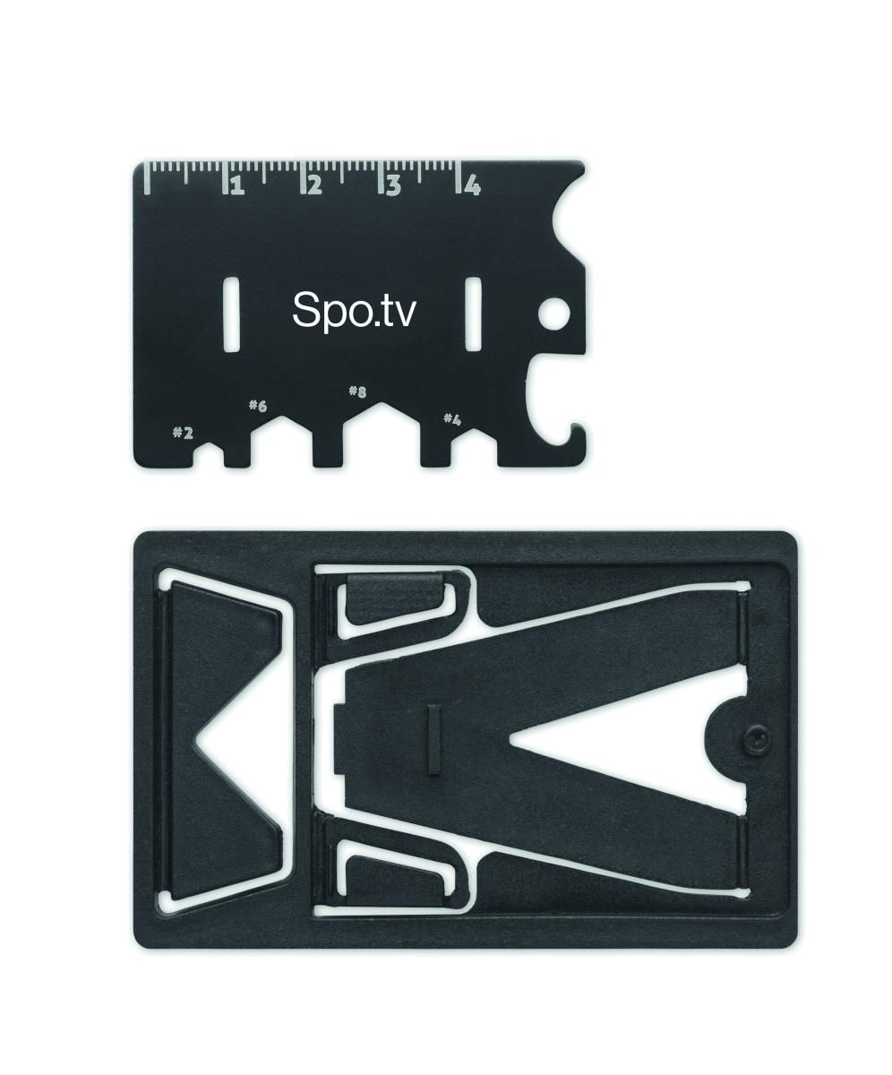 Multiherramienta de acero inoxidable y PP con función de soporte para teléfono con 6 funciones en funda de PU. Incluye destornilladores, regla, llave hexagonal y abrebotellas.