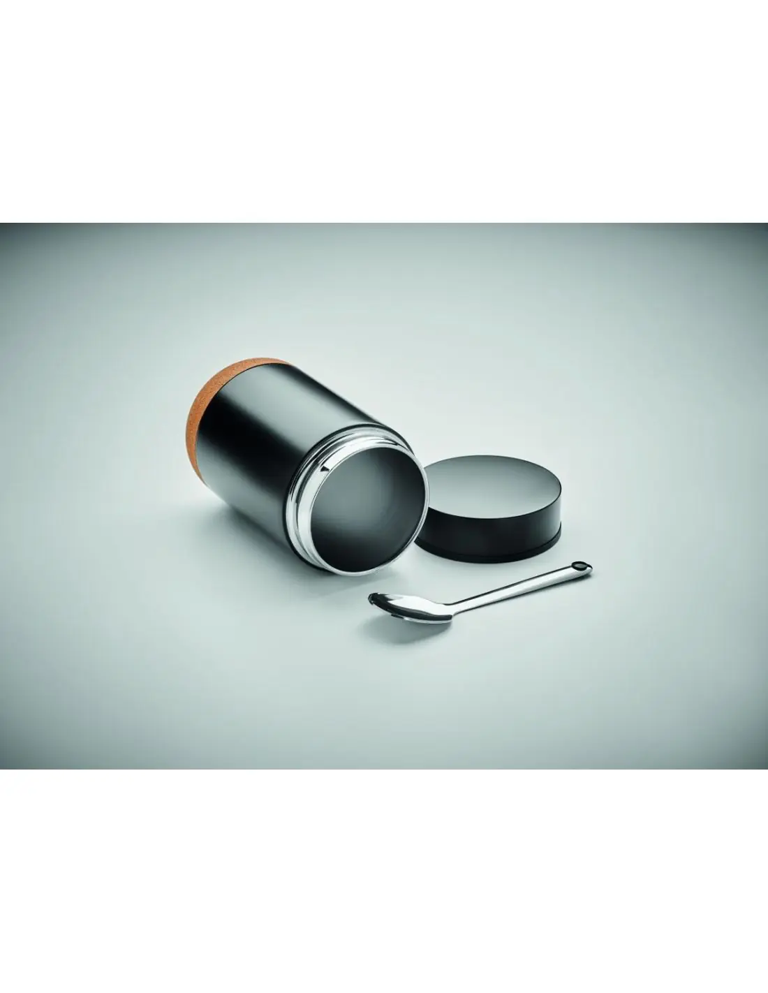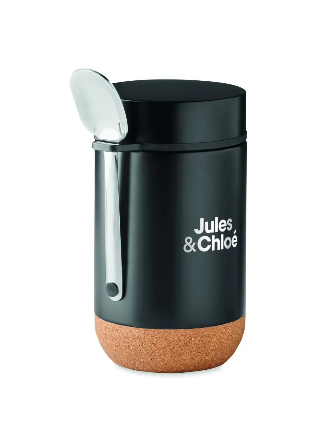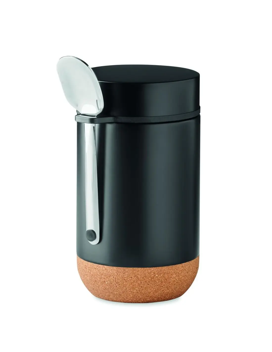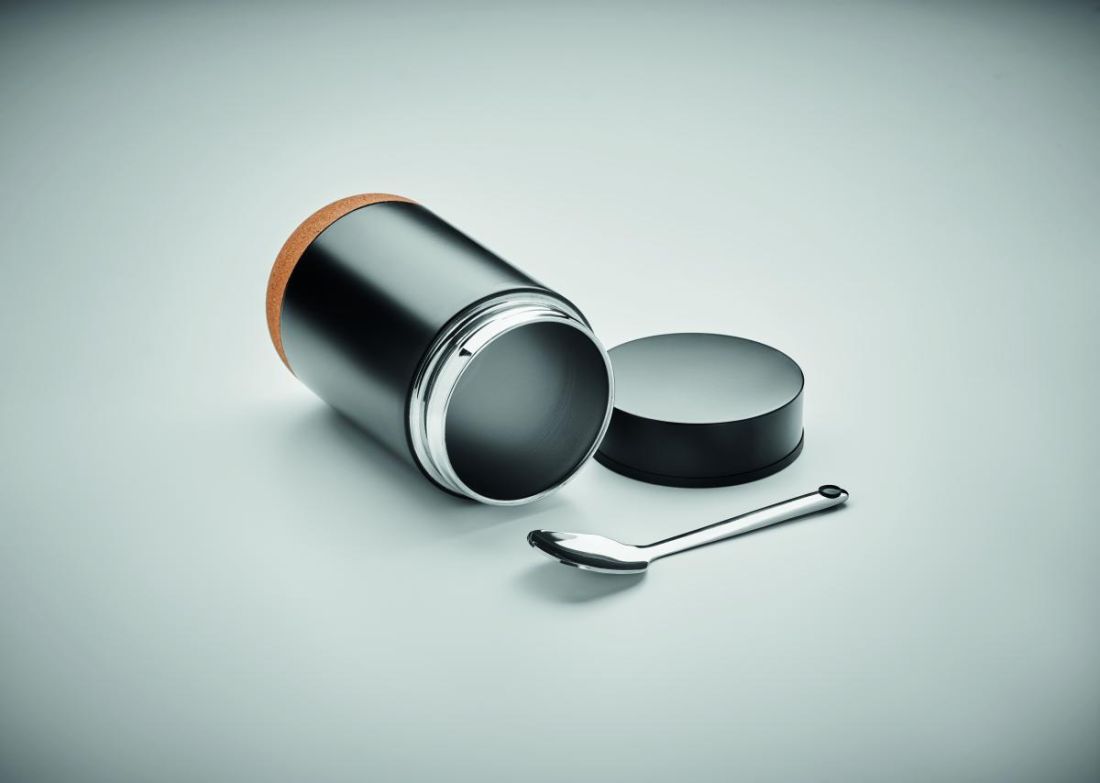 Tarro de doble pared de acero inoxidable con tapa de rosca y detalle de base de corcho. Incluye cuchara. Capacidad: 400 ml. El corcho es un material natural, debido a su naturaleza estructural y porosidad superficial, el resultado final de la impresión por artículo puede tener desviaciones.