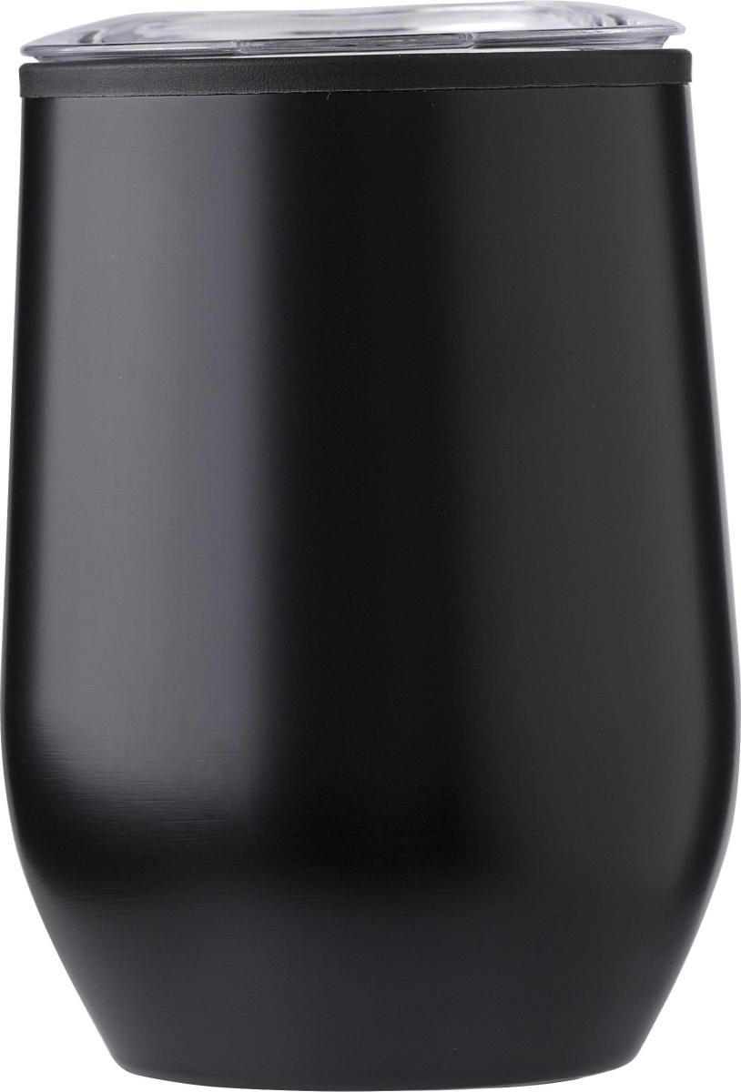 Vaso de acero inoxidable mate (300 ml) con interior de PP y tapa de PS. Presentado en una caja de cartón marrón.