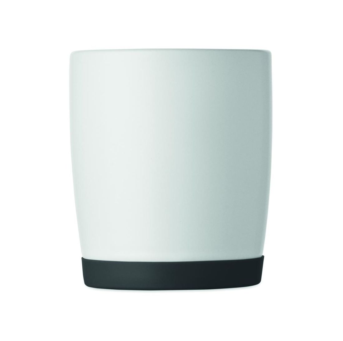 Taza de cerámica con acabado blanco mate y base de silicona para mayor estabilidad. Capacidad 300 ml. Embalaje individual en caja de cartón blanco.