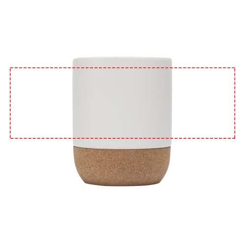 Taza de cerámica con detalle de corcho en el fondo y un revestimiento especial en el exterior que permite la impresión por sublimación. Interior y exterior en blanco brillante. Lavar a mano con agua tibia y detergentes suaves. Se presenta en una caja de regalo de cartón reciclado. Capacidad: 300 ml.