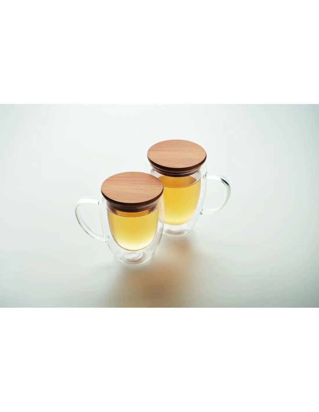Taza de vidrio borosilicato de doble pared con asa y tapa de bambú. Capacidad: 250 ml.