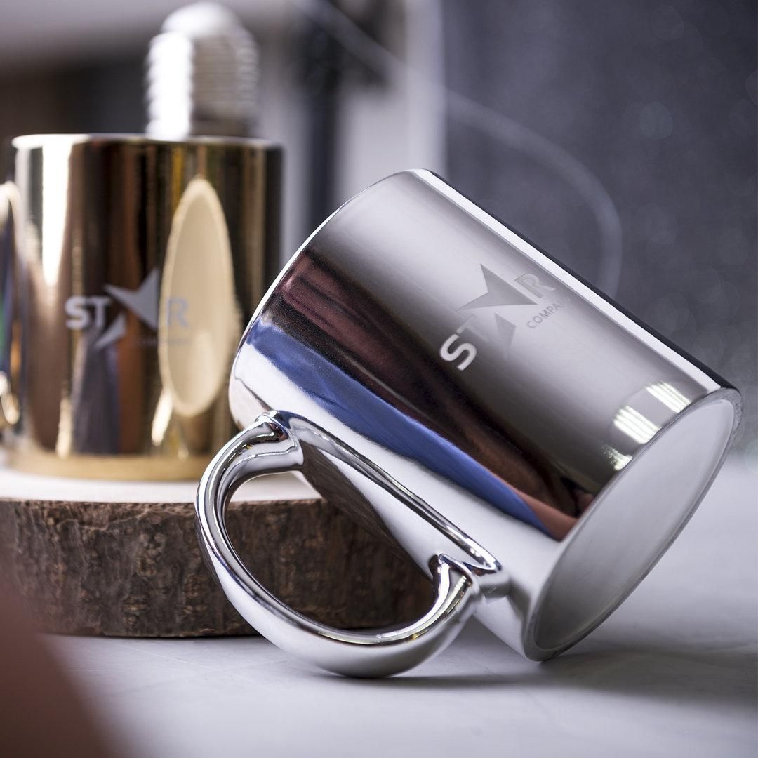 Taza de cerámica de 350ml de capacidad. Disponible en llamativos colores plateado y dorado brillantes. Especialmente diseñada para marcaje en láser, con un recubrimiento exterior metalizado especial para que tu publicidad quede perfectamente grabada en color blanco, a juego con el color interior de la taza. Presentada en caja individual. Se desaconseja su uso en el microondas debido al recubrimiento exterior metalizado.