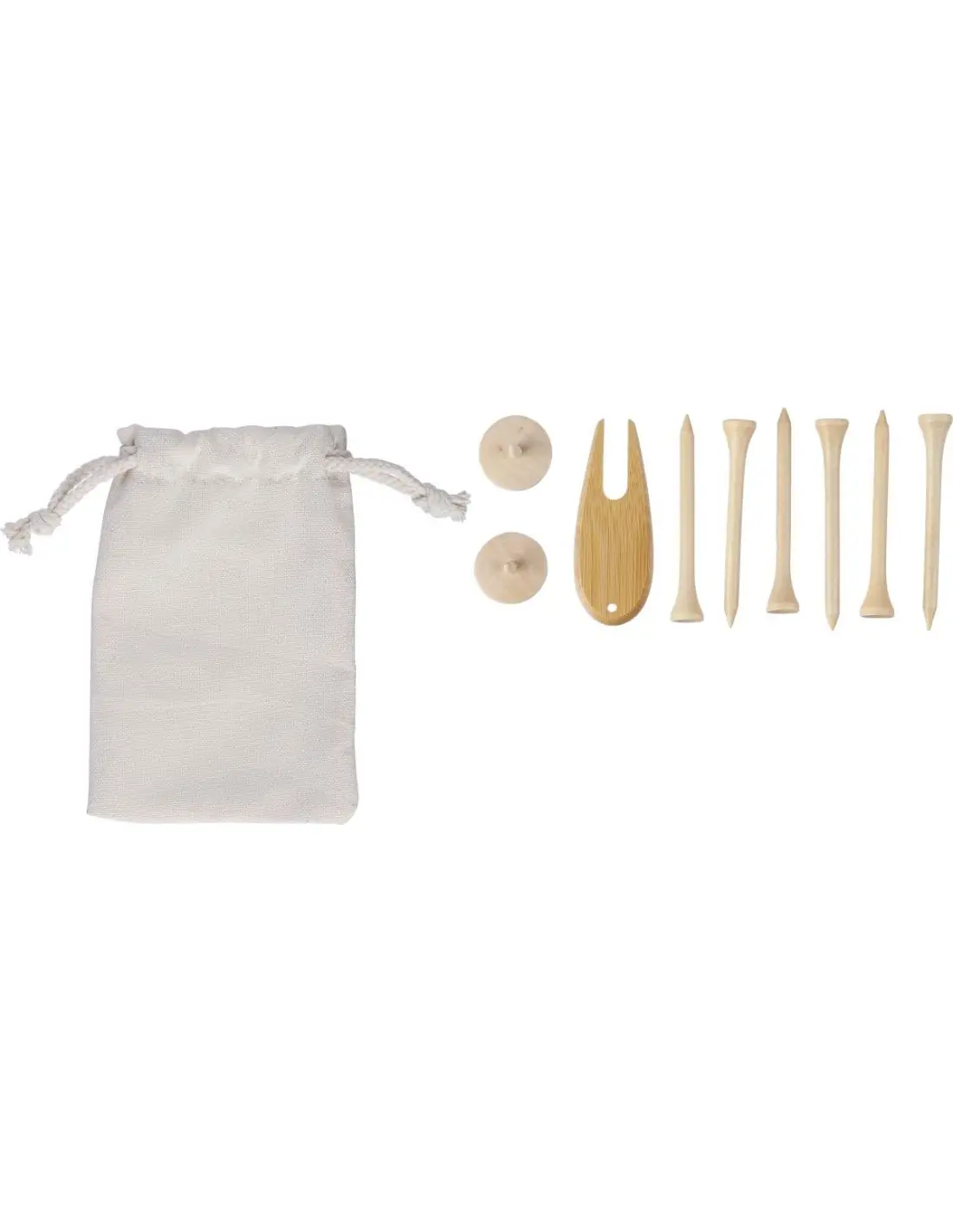 Juego de 6 tees de golf de madera, 1 horca de bambú y 2 marcadores de madera. Presentado en una bolsa de algodón con cordón y una etiqueta en el interior.