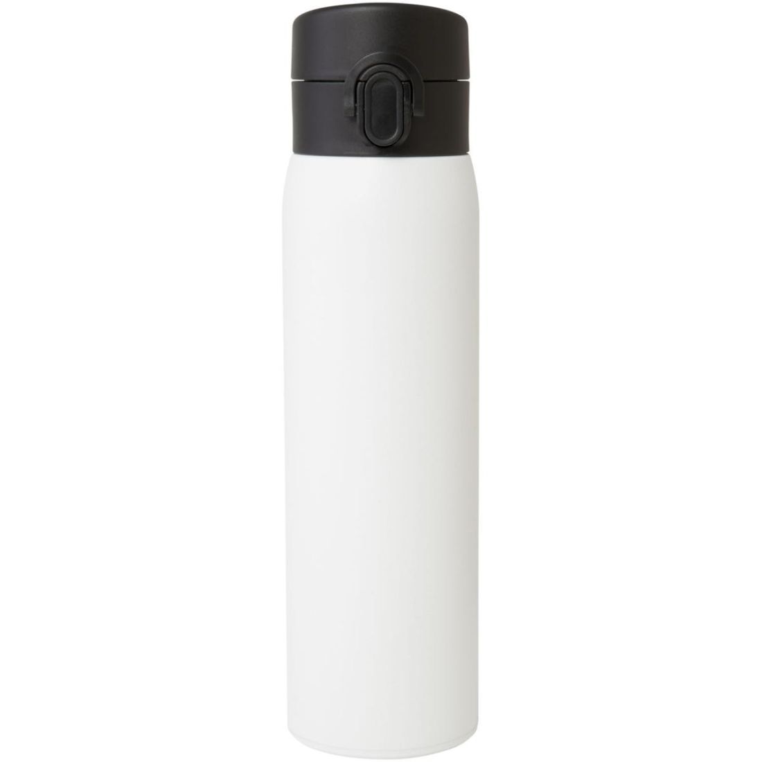 Elegante termo con aislamiento de acero inoxidable reciclado con certificación RCS y sencillo mecanismo de apertura mediante un botón. El termo es hermético y, gracias a su aislamiento de cobre, las bebidas se mantendrán calientes o frías durante varias horas. Capacidad de 450 ml. Se presenta en una caja de regalo de cartón reciclado.