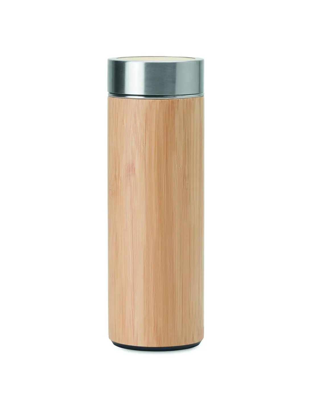 Termo de acero inoxidable de doble capa con carcasa y tapa de bambú e infusor de té. Capacidad: 400 ml. Como el bambú es un material natural, el co…
