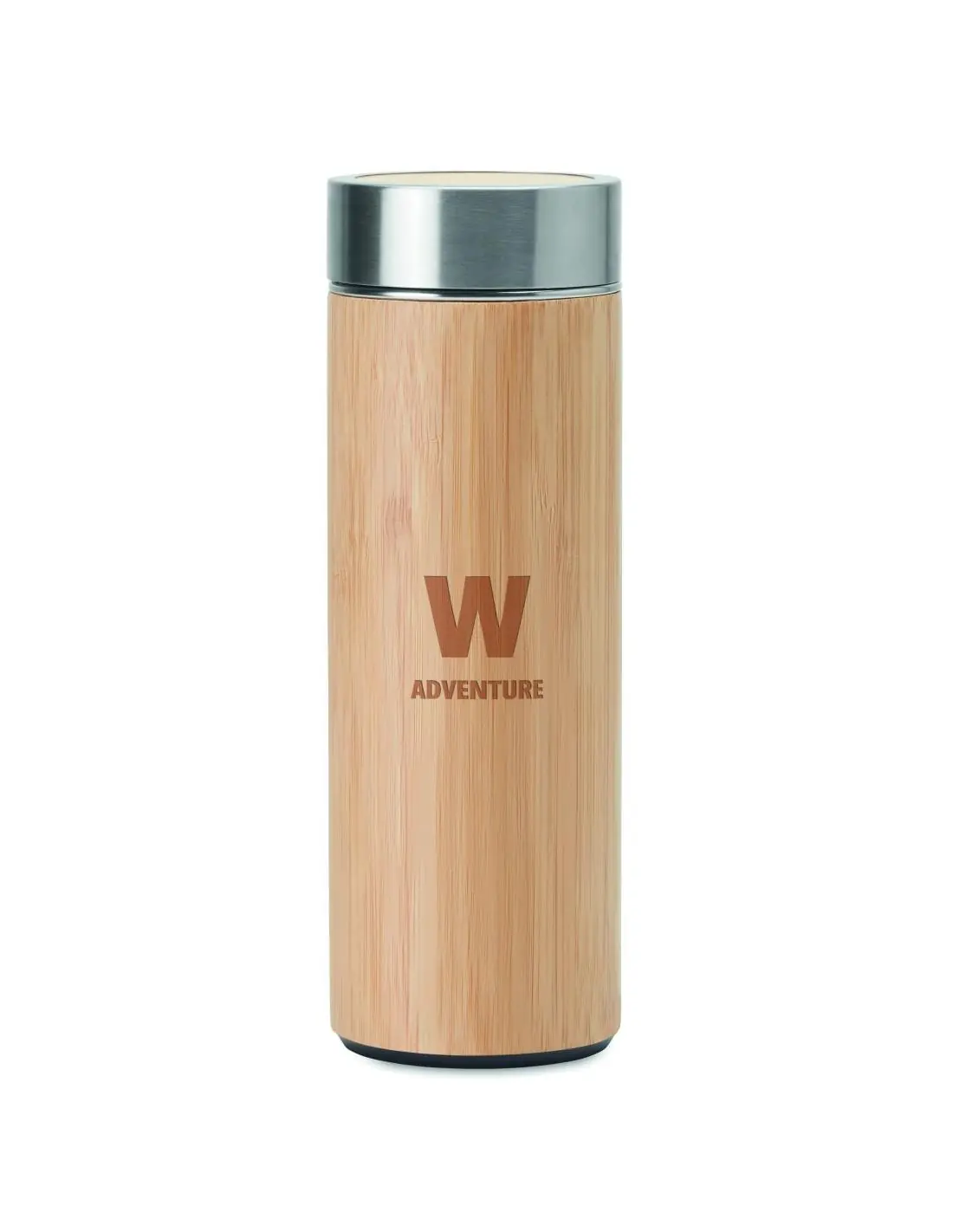 Termo de acero inoxidable de doble capa con carcasa y tapa de bambú e infusor de té. Capacidad: 400 ml. Como el bambú es un material natural, el color por artículo puede variar. FSC®-certified | FSC 100%, N5.7, FSC-C213206