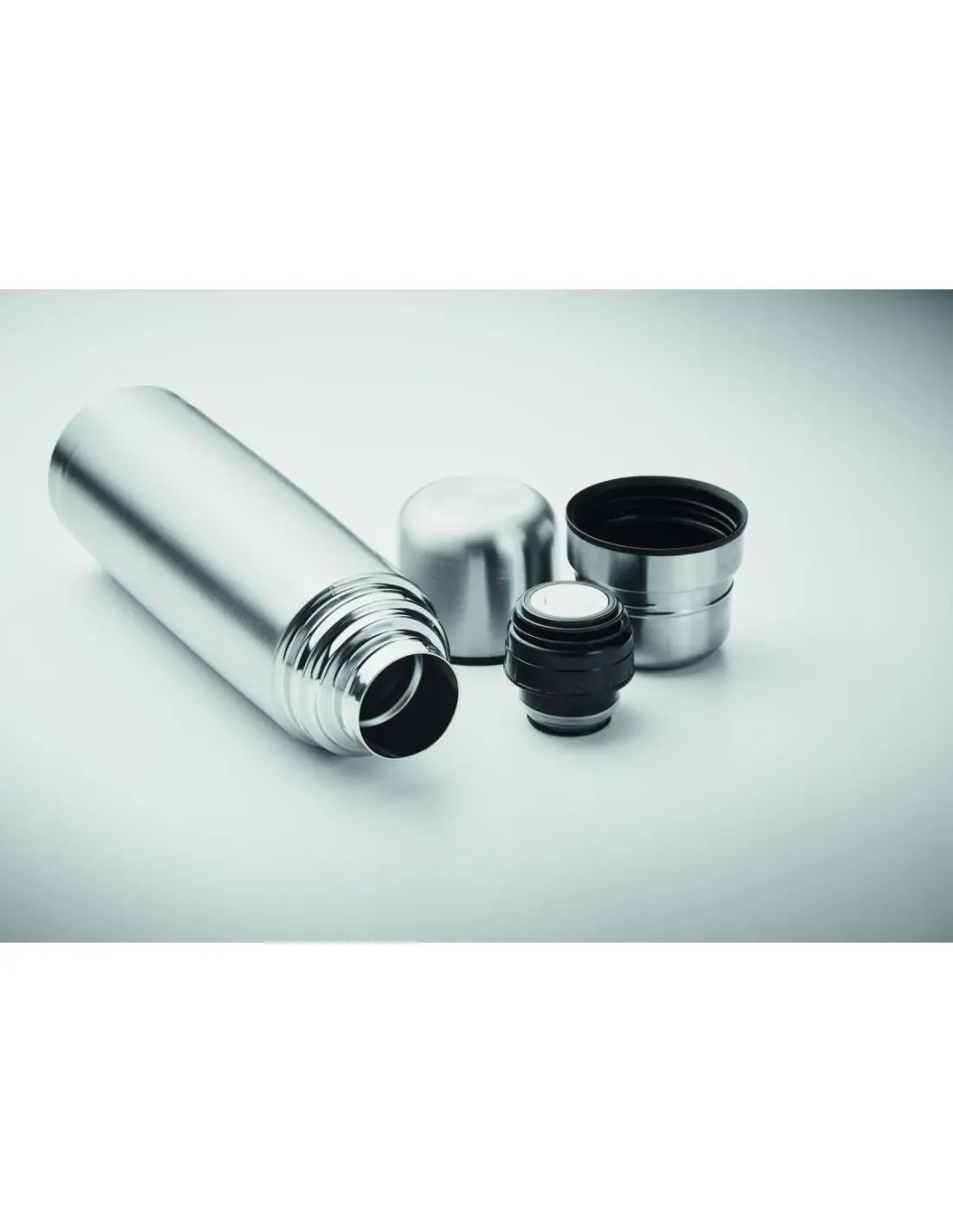 Termo de doble pared de acero inoxidable reciclado y aislado al vacío (90% de acero inoxidable reciclado y 10% de acero inoxidable) con 2 tazas en la tapa (pared interior de PP). Capacidad: 750 ml, vaso exterior 150ml, vaso interior: 125ml.