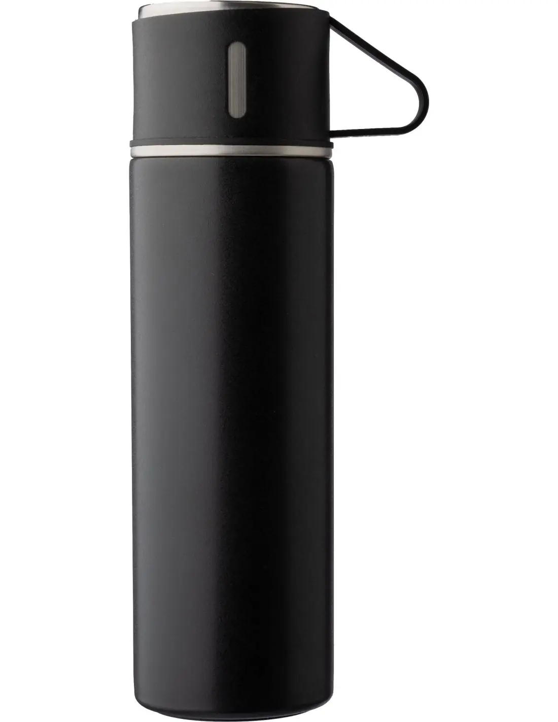 Set de botella termo de doble pared de acero inoxidable (s/s304) (420 ml) con taza en la tapa, y dos tazas más (150 ml). Presentado en una caja de cartón marrón.