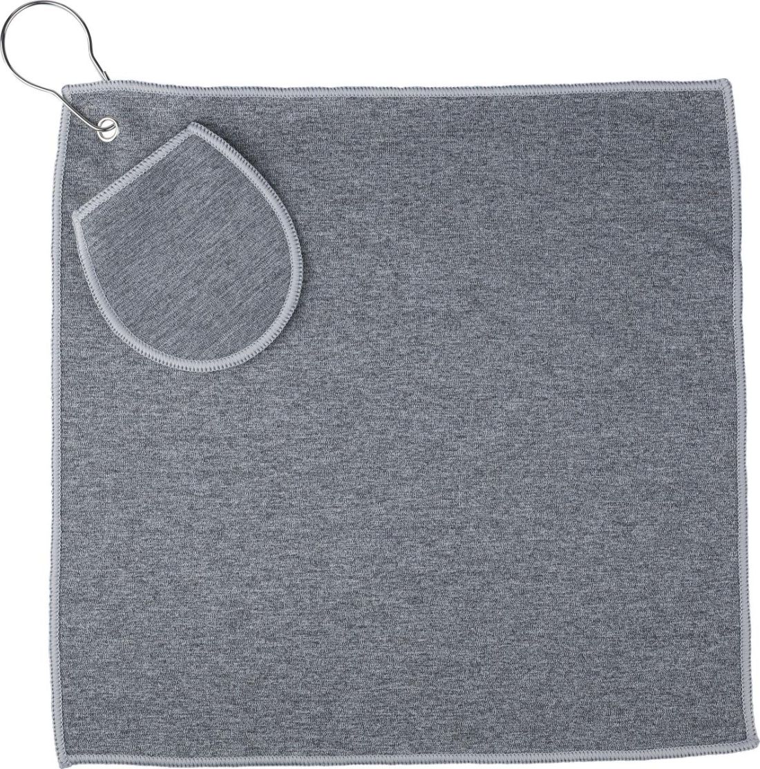 Toalla de golf de rPET con bolsillo para una pelota. Presentada en una funda con mosquetón de metal para sujetarlo fácilmente a su bolsa e incluye en el interior una etiqueta indicando que es material reciclado. Lavable a máquina (con agua fría).