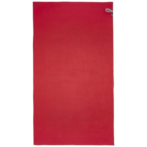 La toalla deportiva absorbe muy bien, es ligera, se seca rápido y su tejido es duradero y extremadamente suave. Cuando la toalla está doblada y sujeta con la banda elástica, se reduce a un tamaño pequeño, por lo que es ideal para llevarla al gimnasio y a la piscina o para ir de mochilero o de acampada. La toalla tiene un tamaño de 180 × 100 cm y está fabricada con un 90 % de poliéster reciclado con certificación GRS y un 10 % de nylon, y puede lavarse en la lavadora a 40 °C. Se entrega con una bolsa de almacenamiento (25 × 8,5 cm) fabricada con plástico PET reciclado, con una gran superficie para imprimir un logotipo.