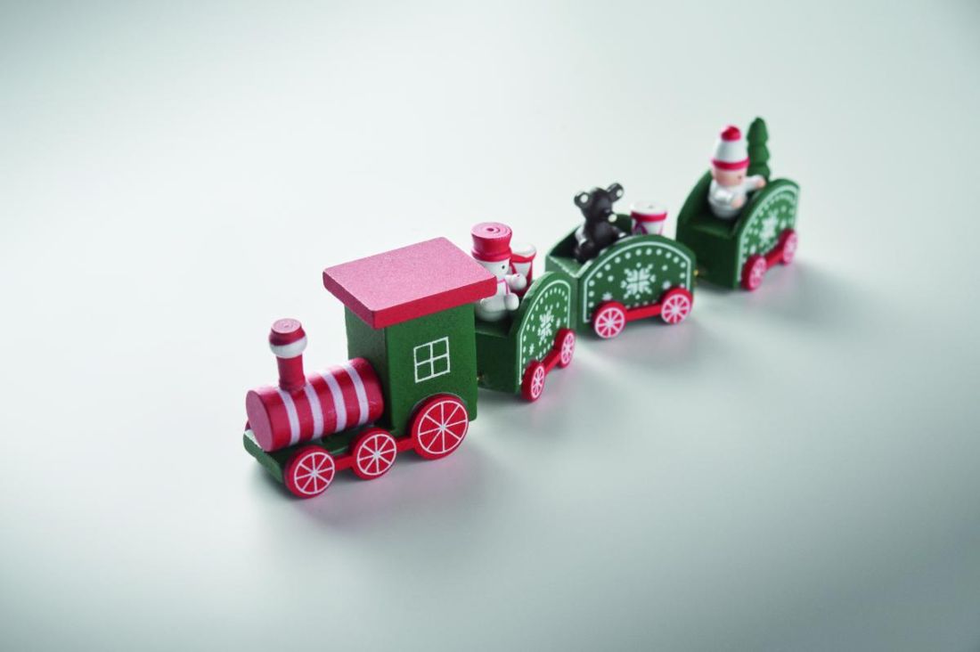 Tren de madera con motivos navideños.