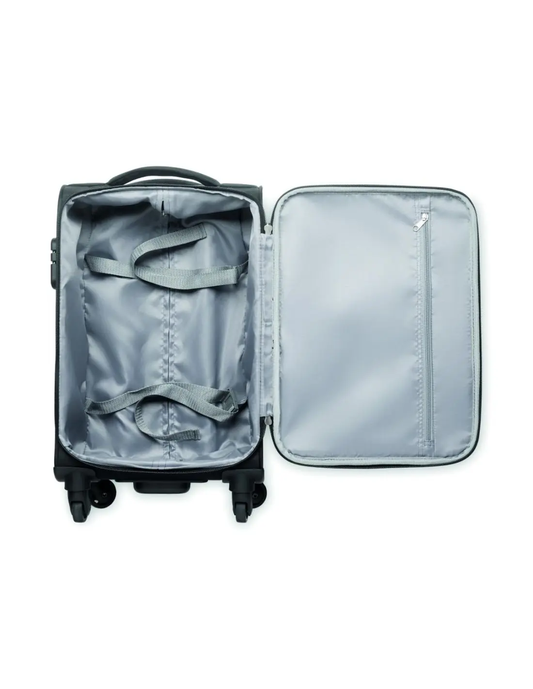 Trolley de poliéster RPET 600D. Compartimiento con cremallera para el portátil. Bolsillo frontal con cremallera. Candado. Compartimento inferior con cintas. Poliéster RPET 600D. Armazón de doble tubo. Forro 210D RPET y detalles de PU.
