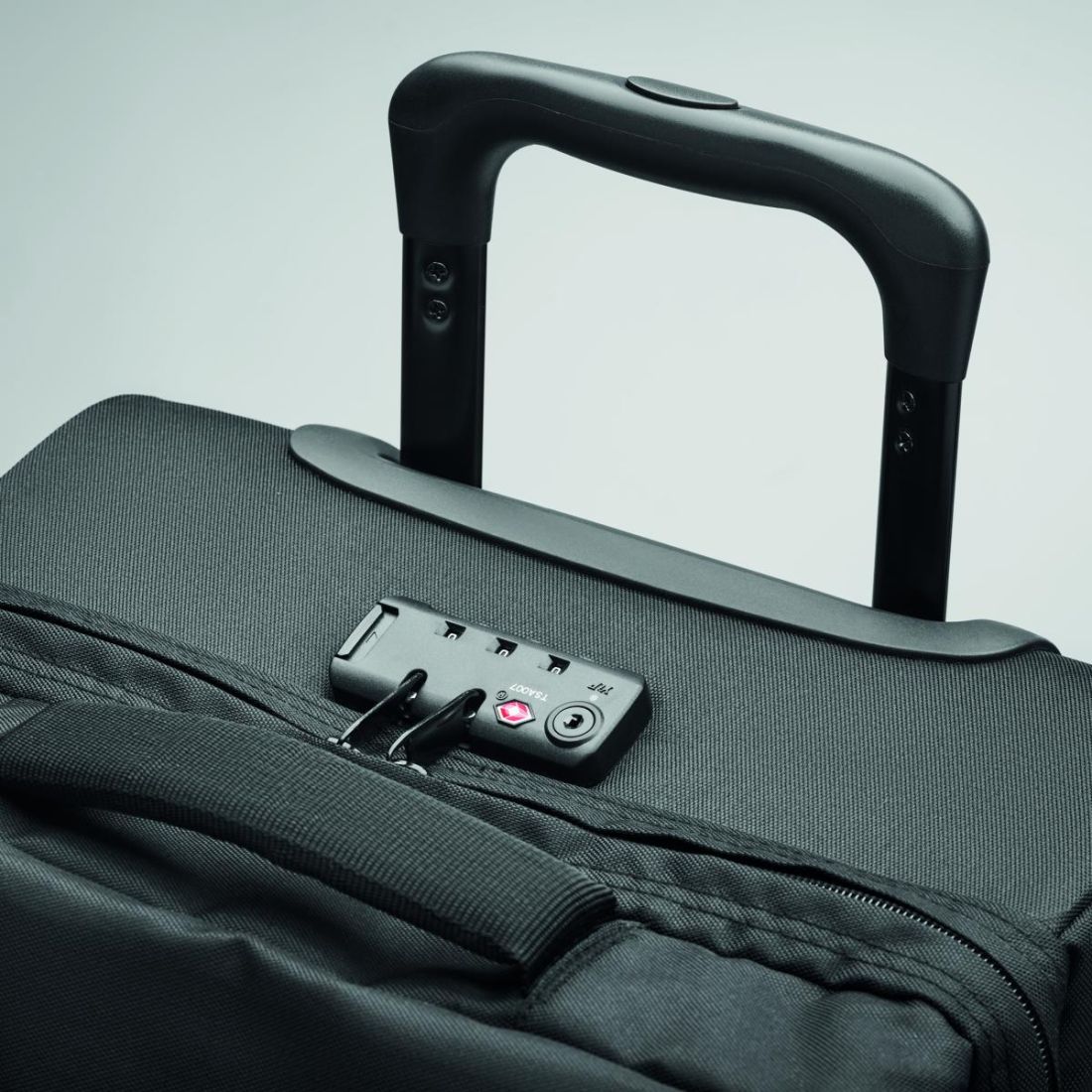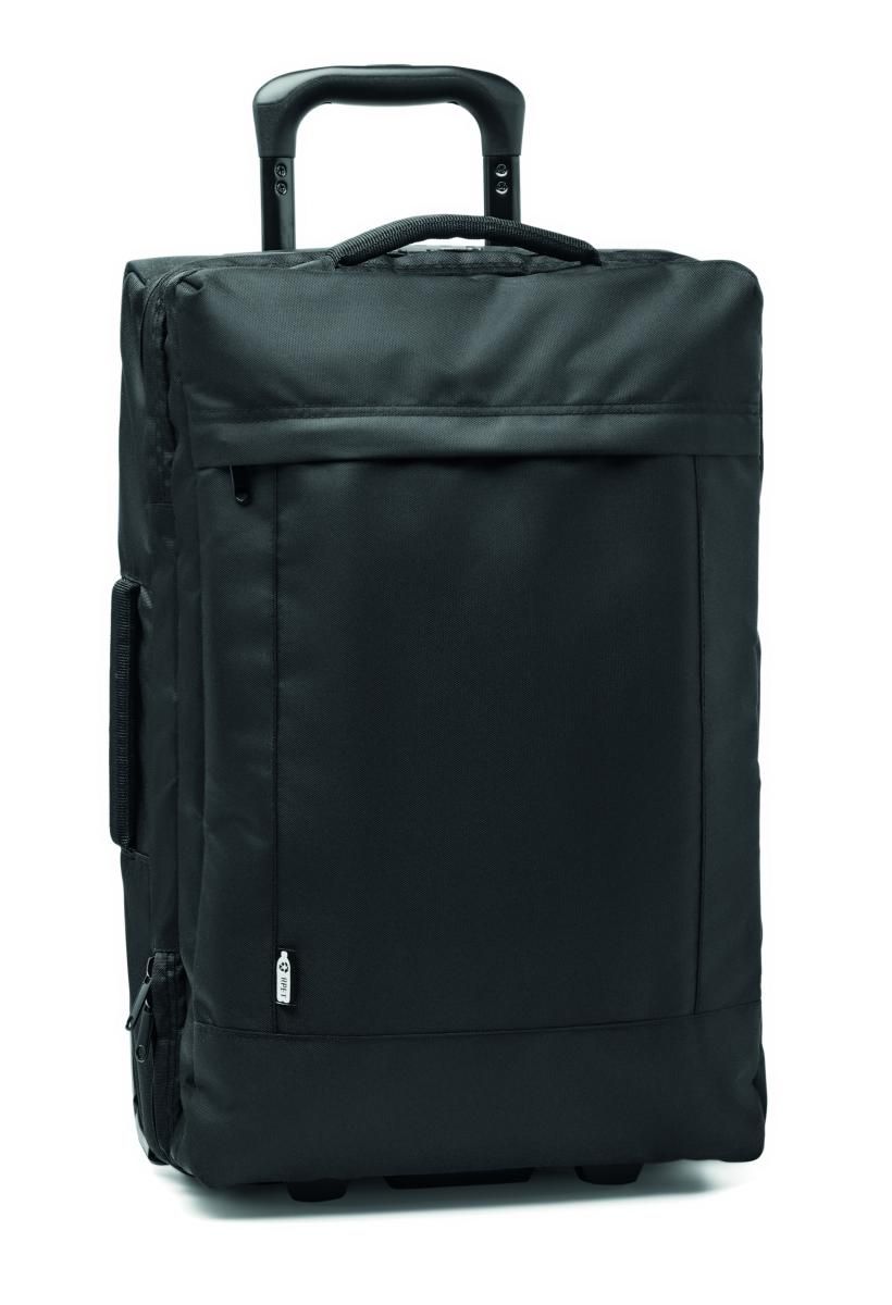 Trolley de RPET 600D con base rígida. Compartimento doble, compacto y espacioso con cremallera. Un bolsillo frontal con cremallera y asas superior, lateral e inferior. Cierre de seguridad integrado. 2 ruedas.