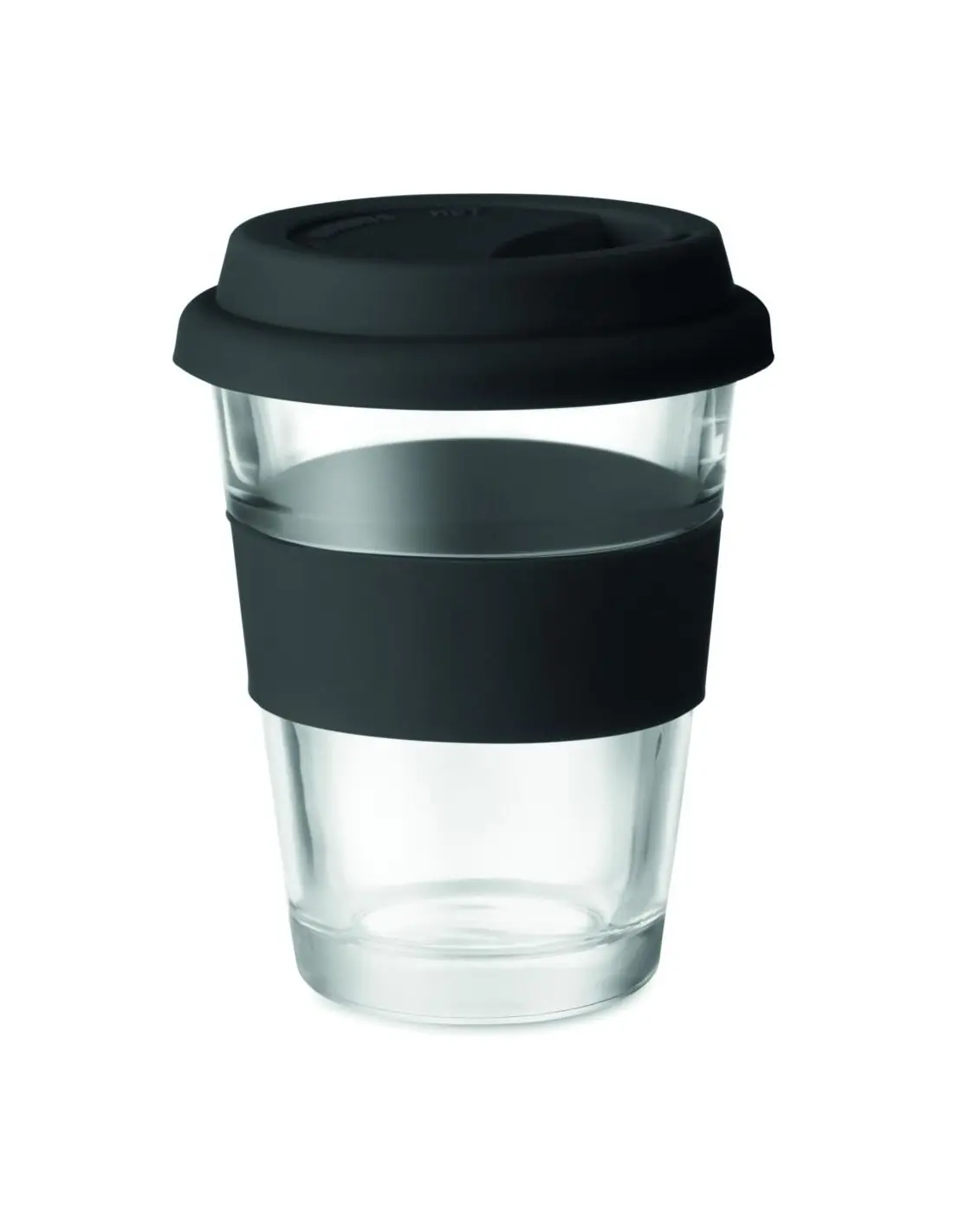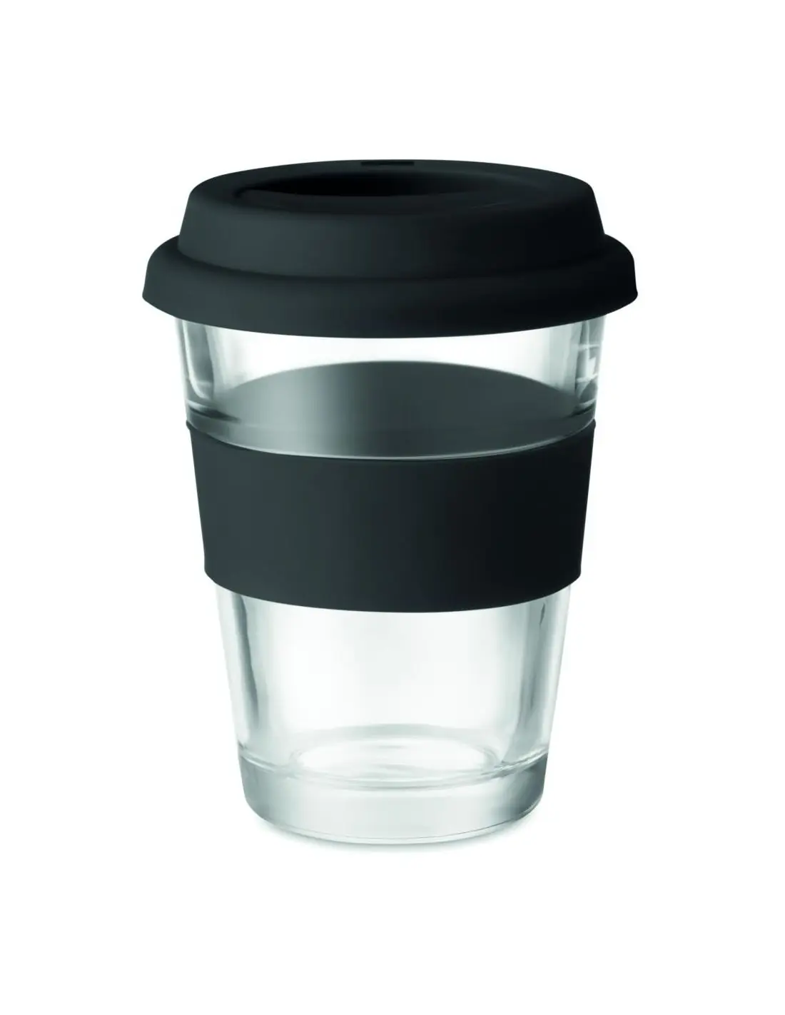Vaso de cristal con tapa y faja de silicona antideslizante para un agarre firme sin quemaduras. Capacidad 350 ml. Al tratarse de un vaso de una sola pared, puede producirse transferencia de calor.