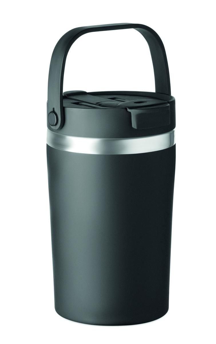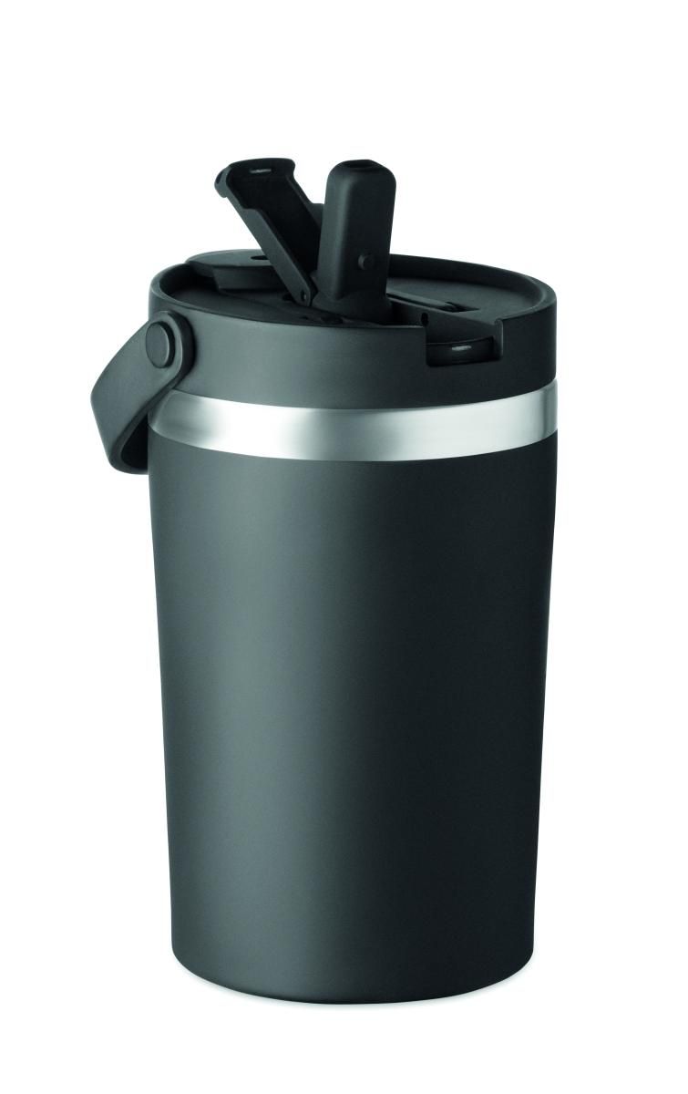 Vaso de doble pared de acero inoxidable reciclado (90% de acero inoxidable reciclado y 10% de acero inoxidable) con tapa de PP 2 en 1 para sorber y pajita. Resistente y sin fugas. Capacidad: 350 ml.