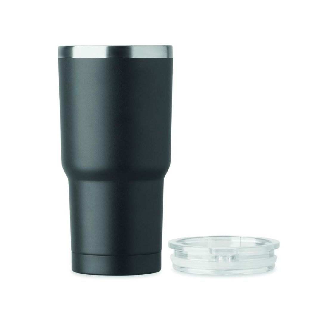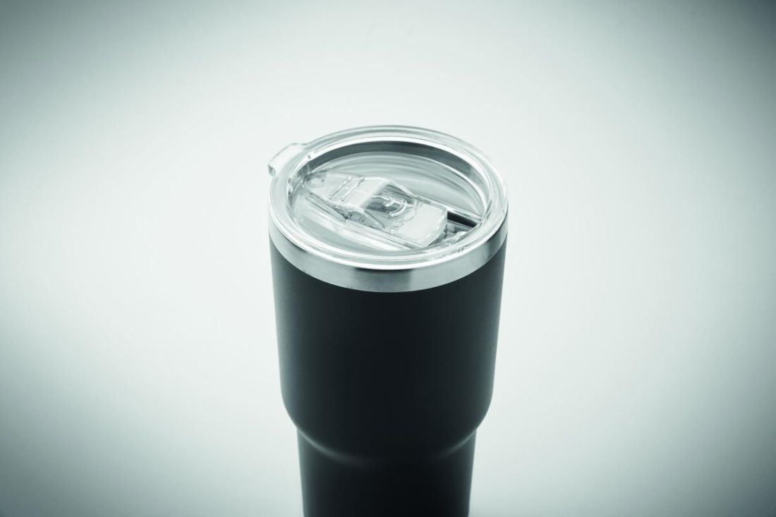 Vaso de acero inoxidable reciclado de doble pared (90 % acero inoxidable reciclado y 10 % acero inoxidable). Tapa con orificio deslizante para beber. Antifugas. Capacidad: 500 ml.