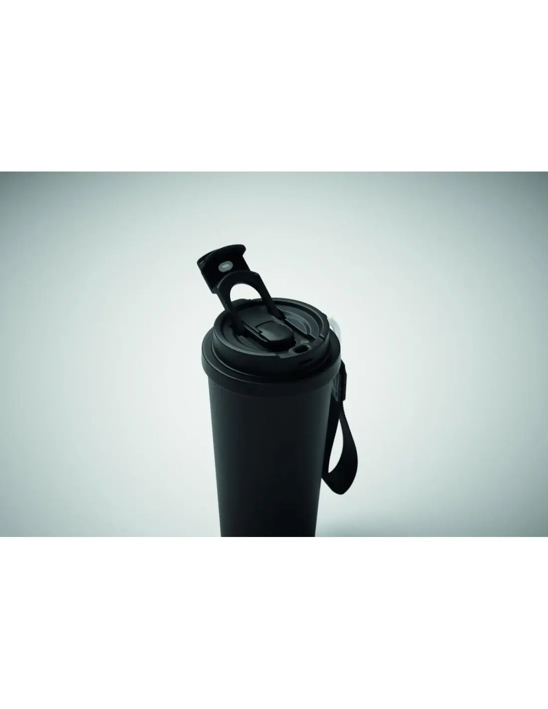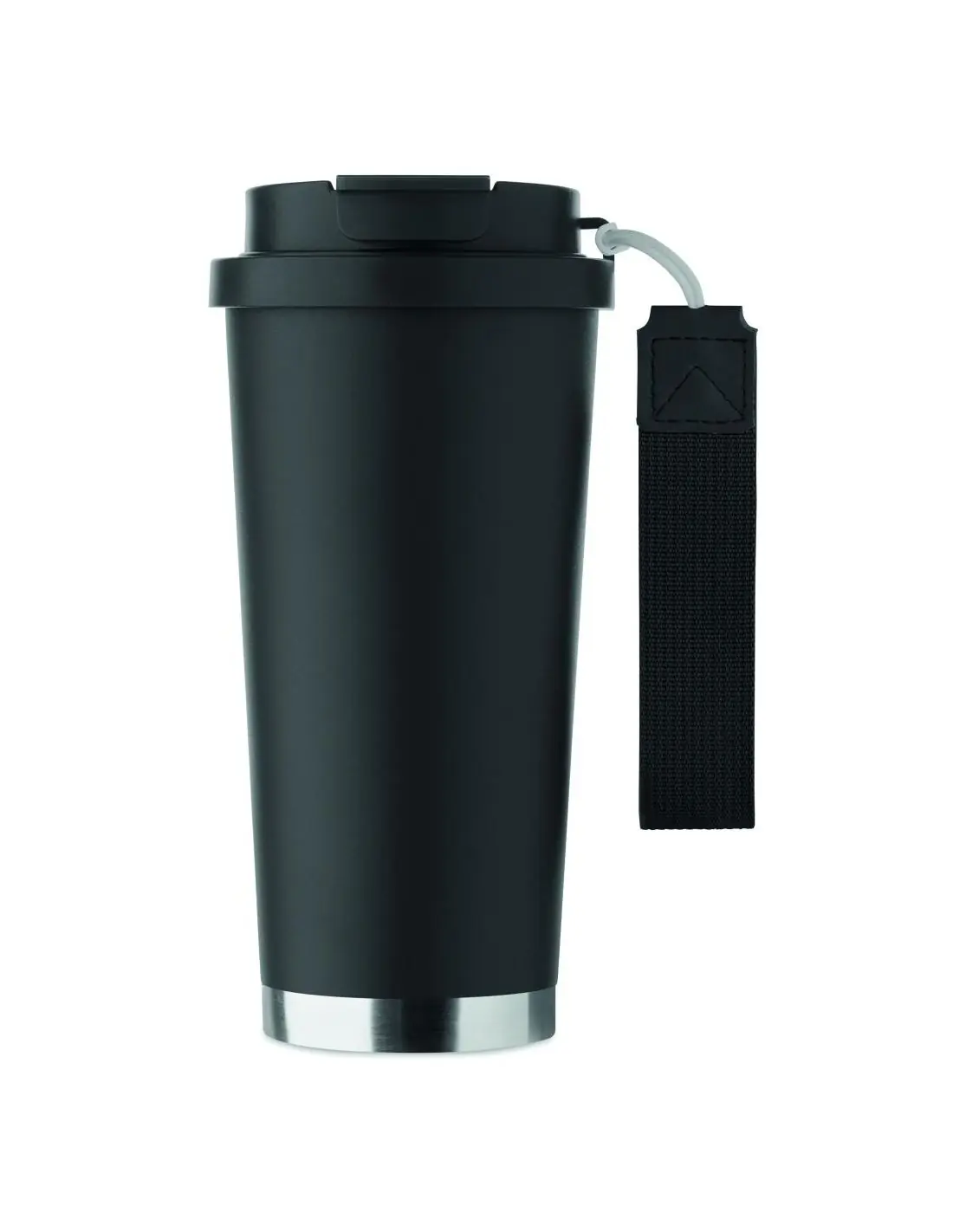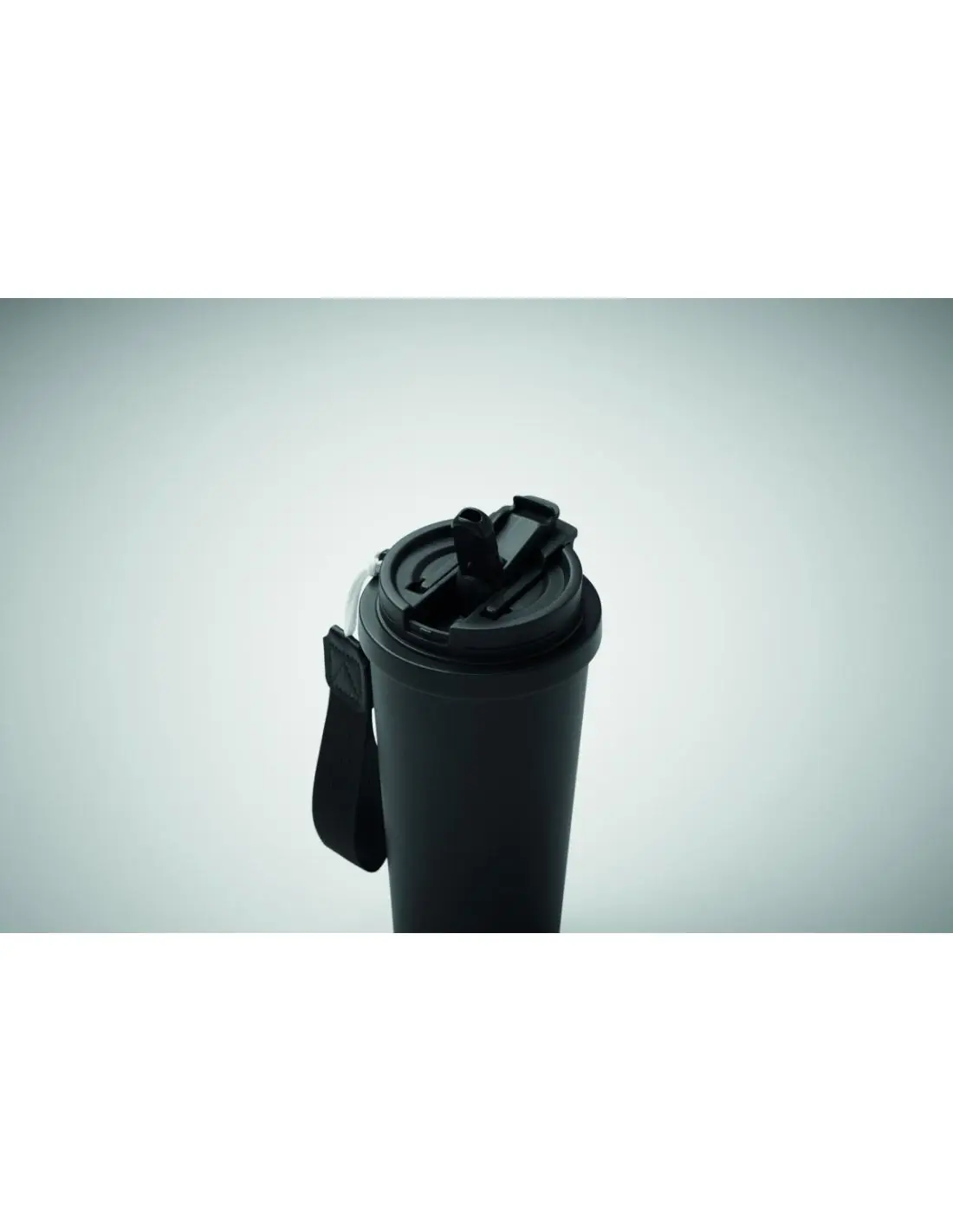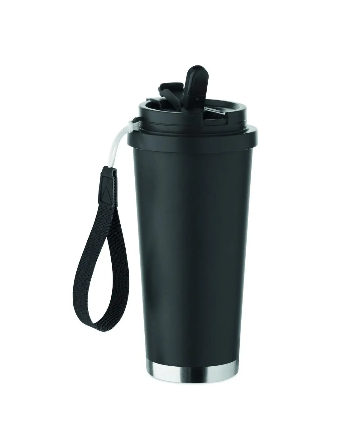 Vaso de acero inoxidable reciclado de doble pared con tapa de PP (tapa 2 en 1 para beber y pajita) y con correa de transporte de RPET. Anti fugas. Capacidad: 500 ml.