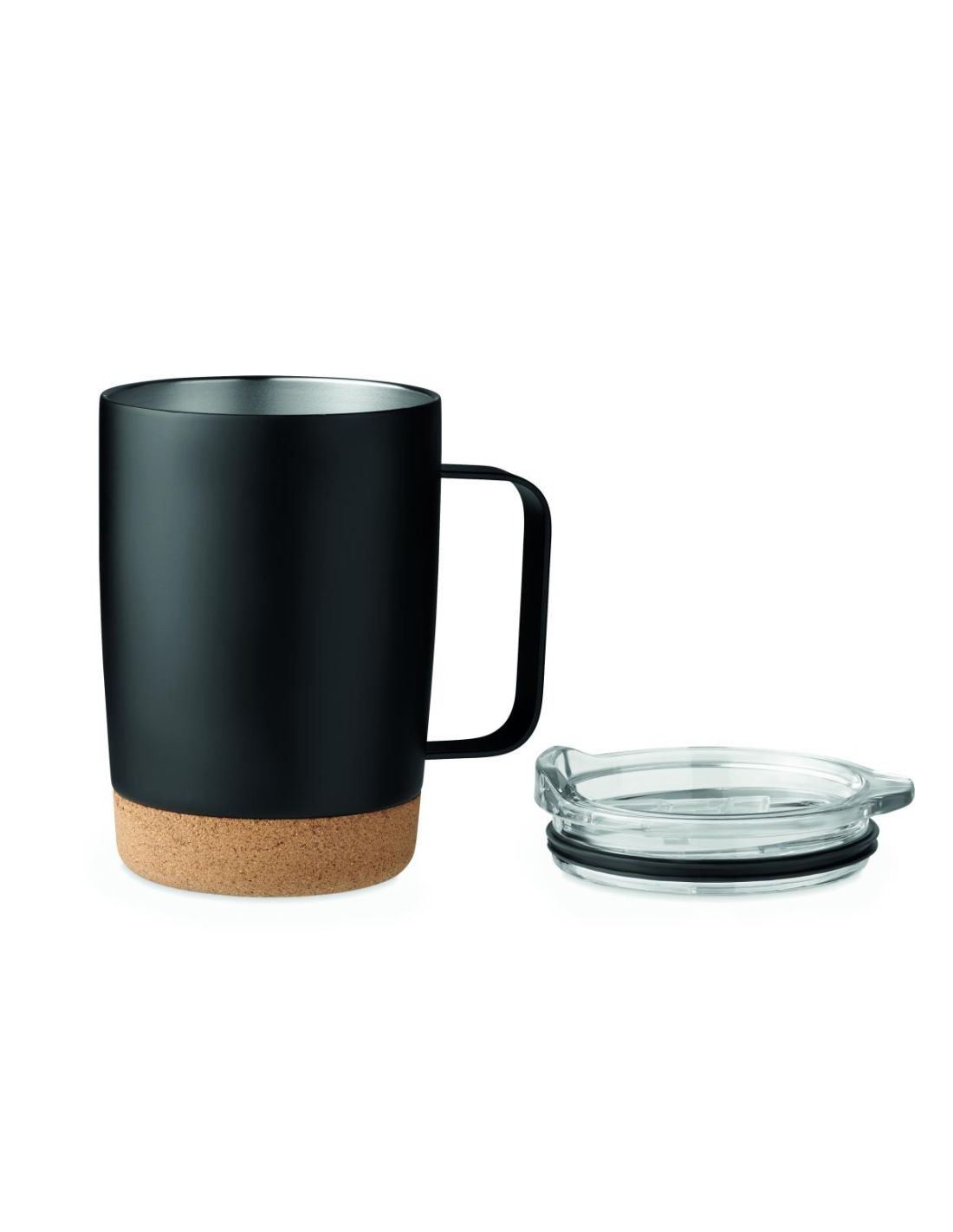 Vaso de acero inoxidable de doble pared con base de corcho y tapa con orificio deslizante para beber. Capacidad: 300 ml. El corcho es un material natural, debido a su naturaleza estructural y porosidad superficial, el resultado final de la impresión por artículo puede tener desviaciones. Sin fugas.