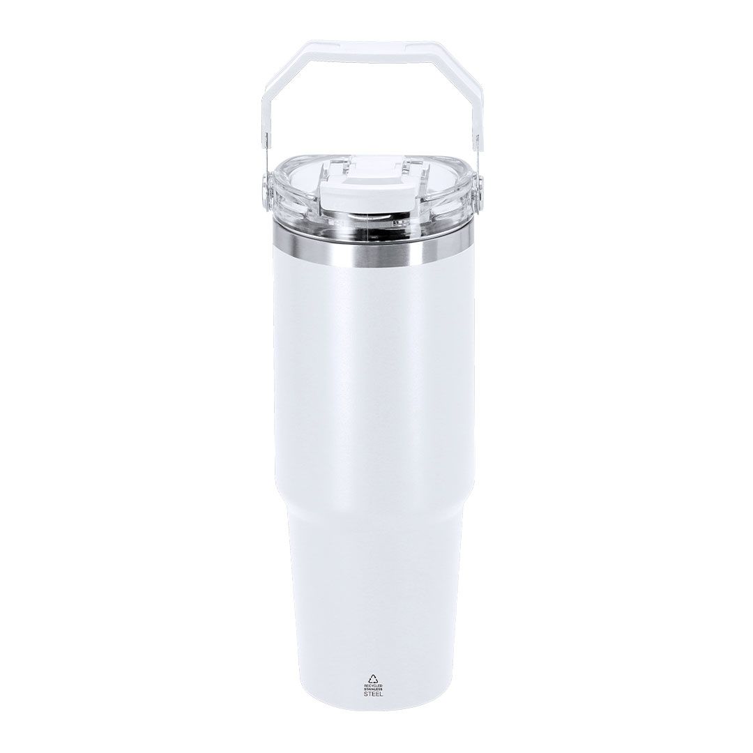 Vaso térmico con 900 ml de capacidad con doble pared. Fabricado en Acero Inoxidable Reciclado. Cuenta con doble sistema de bebida: orificio con cierre hermético y pajita integrada, adaptándose a las preferencias de uso. Con tapa de sistema de sellado hermético. Incluye práctica asa de transporte, ideal para transportarlo fácilmente en cualquier situación. Libre de BPA. Con distintivo de Acero Inoxidable Reciclado.