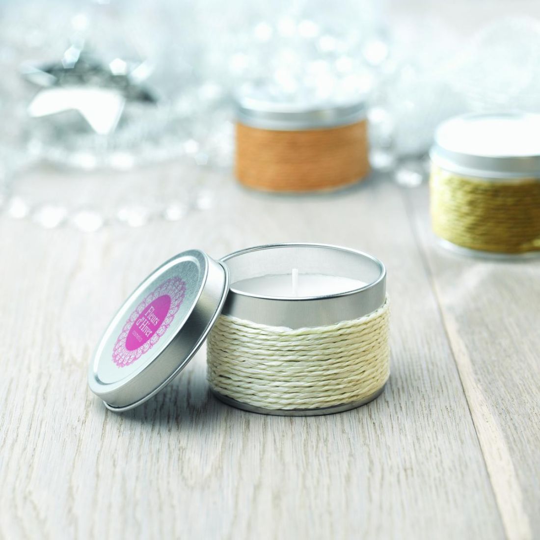 Vela perfumada de cera vegetal de 60 g en caja metálica decorativa.