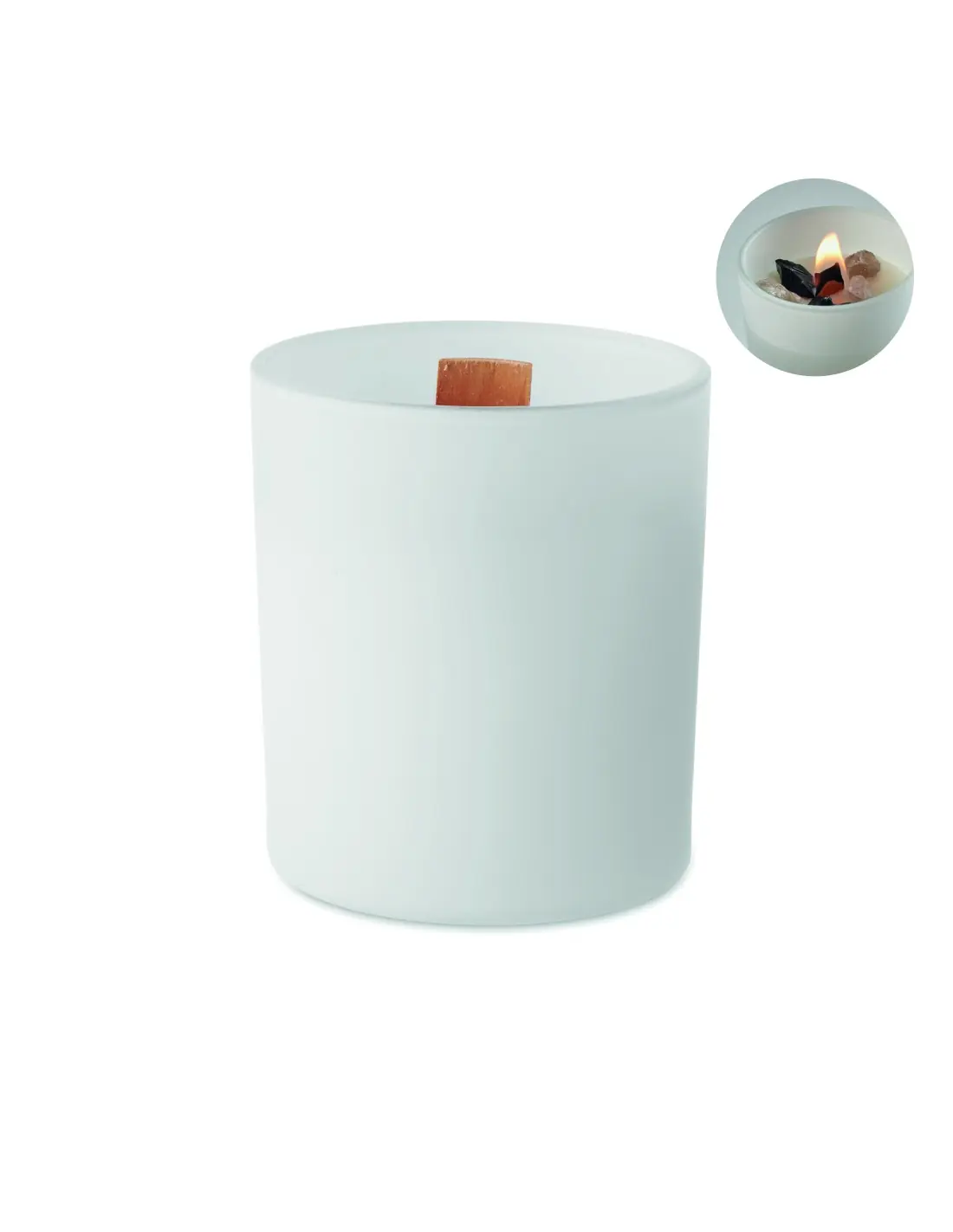 Vela de cera vegetal con fragancia de vainilla, en vidrio con piedras y mecha de madera. 200 gr. Tiempo de combustión: 20 horas.