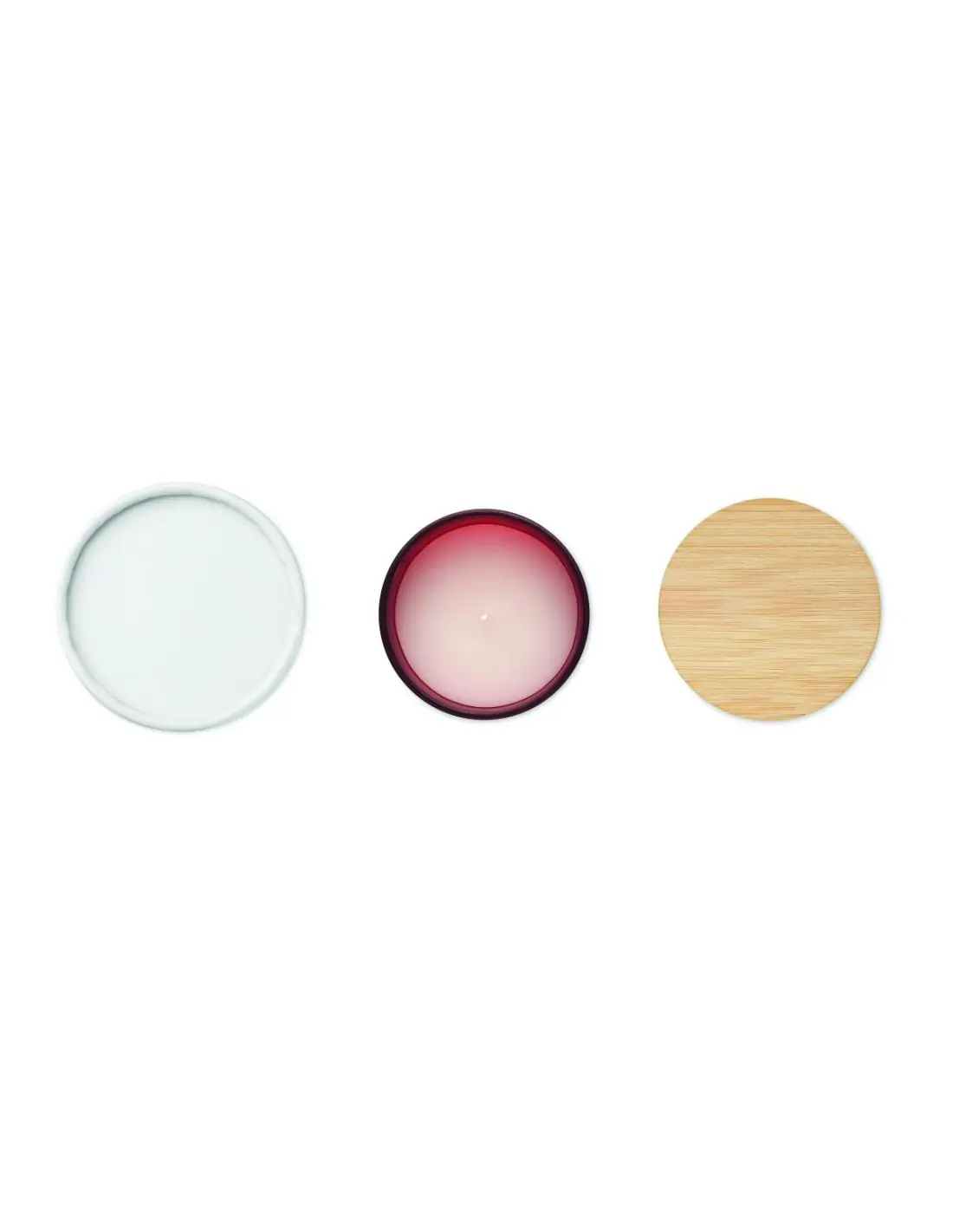 Vela de cera con fragancia de plantas en un tarro de cristal opaco con tapa de bambú. 200 gr. Tiempo de combustión: 33 horas. Presentada en una caja de papel tubular de regalo. El bambú es material natural, el color del articulo puede variar.