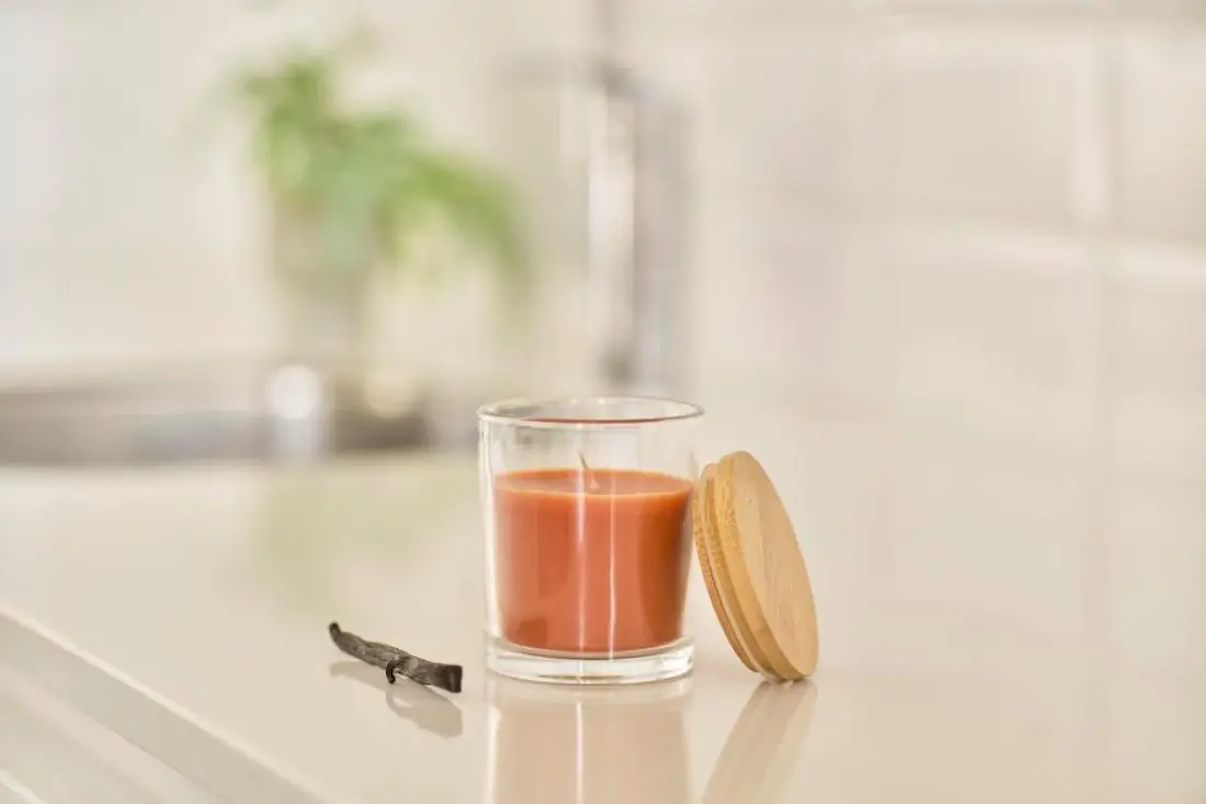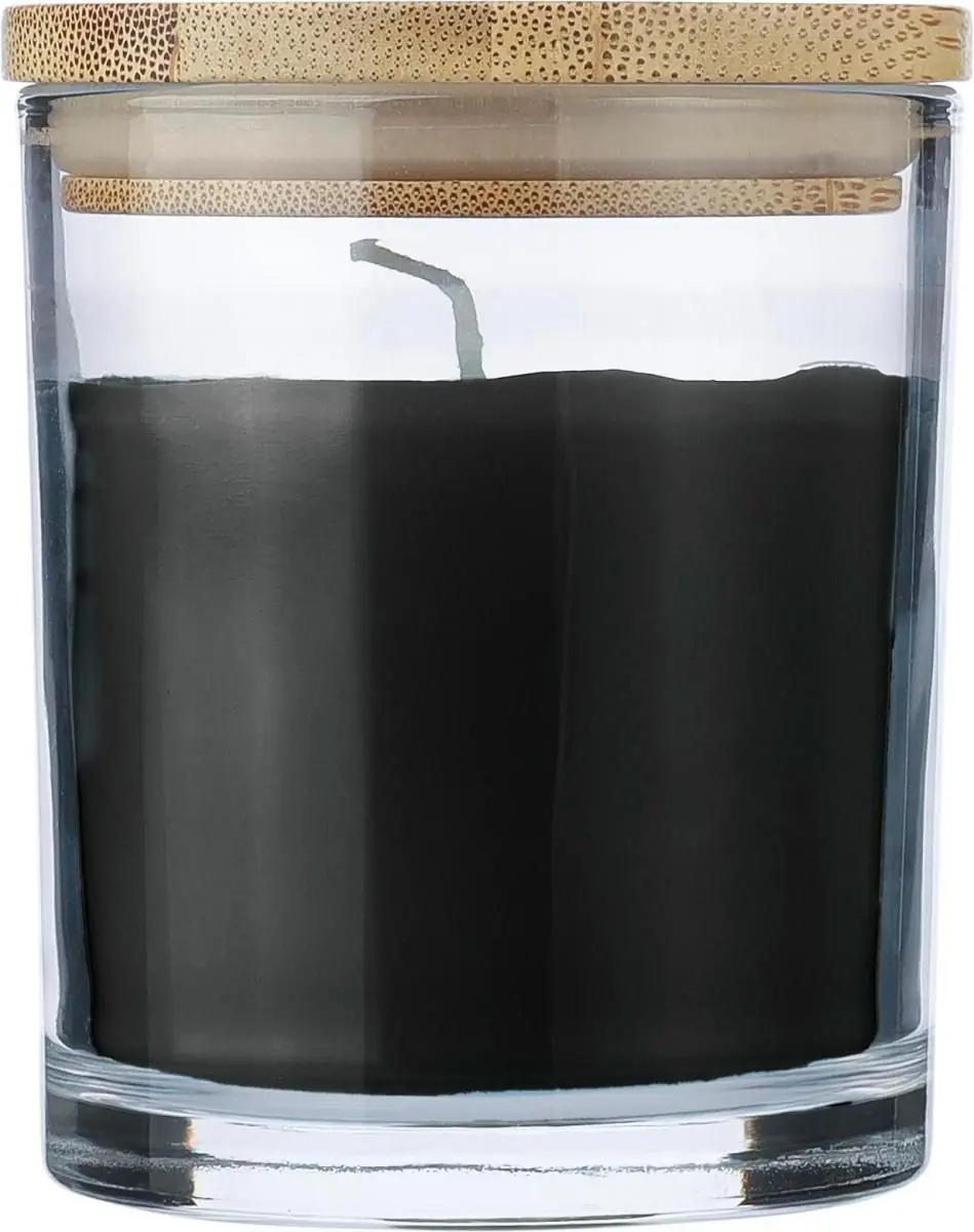 Vela de vidrio transparente con 120 gramos de cera de color y aroma a vainilla, con tapa de bambú. Proporciona aproximadamente 20 horas de combustión. Presentada en un estuche tubular de cartón blanco.