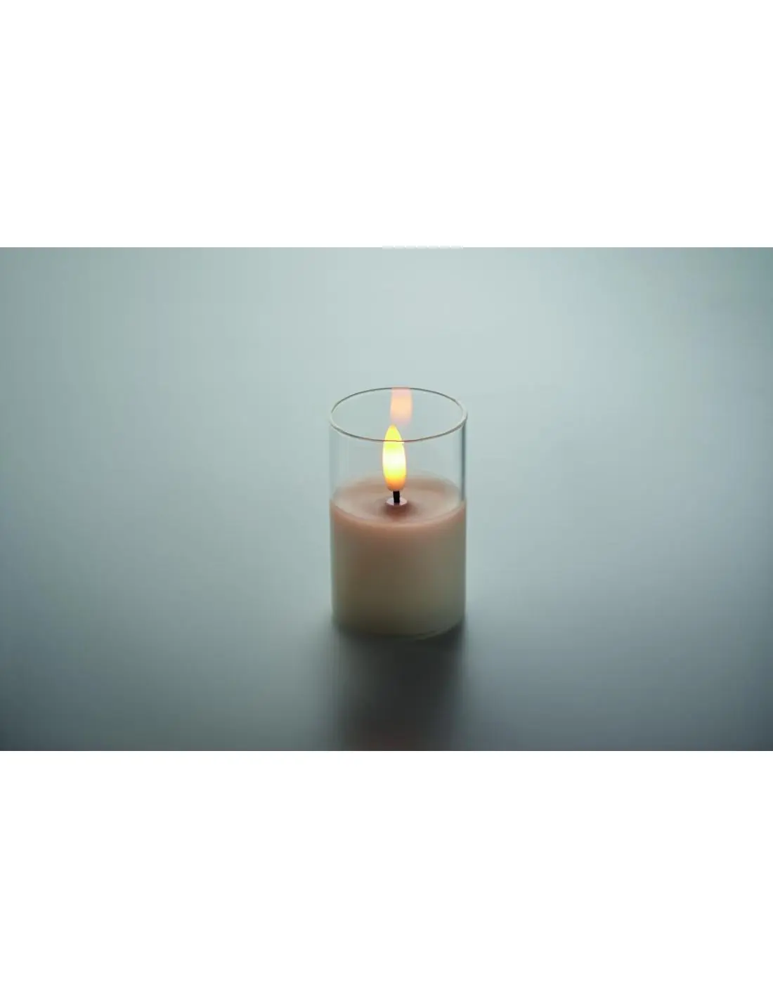 Pequeña vela de cera LED con efecto de llama real en soporte de cristal. Incluye pila CR2032.