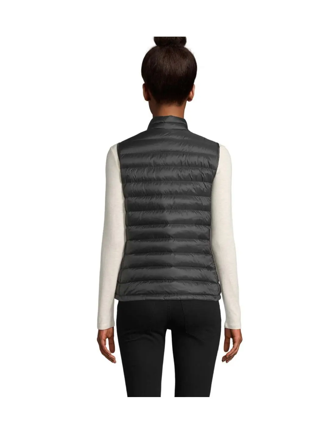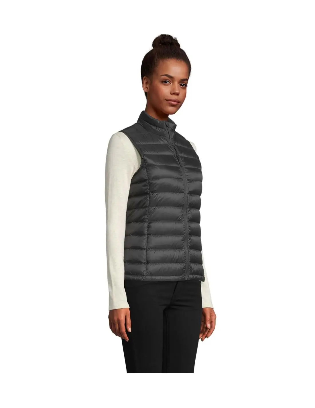SOL'S WILSON BW MUJER. Chaleco ligero acolchado para mujer. Tejido exterior y forro: 100% poliamida. Acolchado 60% Sorona 40% poliéster reciclado. POLIAMIDA 380T, apertura con cremallera, 2 bolsillos delanteros con cremallera, 2 bolsillos interiores, cuello alto pequeño, corte ceñido, sistema de doblado ''en bolsa'' con topes. OEKO-TEX®. Sólo se vende con impresión.